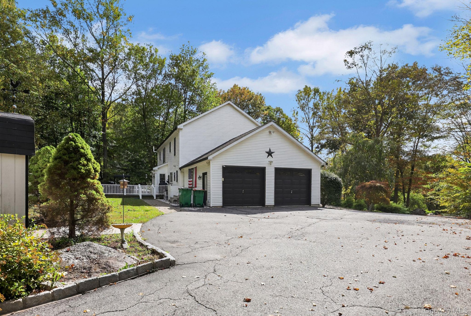 - View of side of property featuring asphalt driveway, an attached garage, and view of wooded area