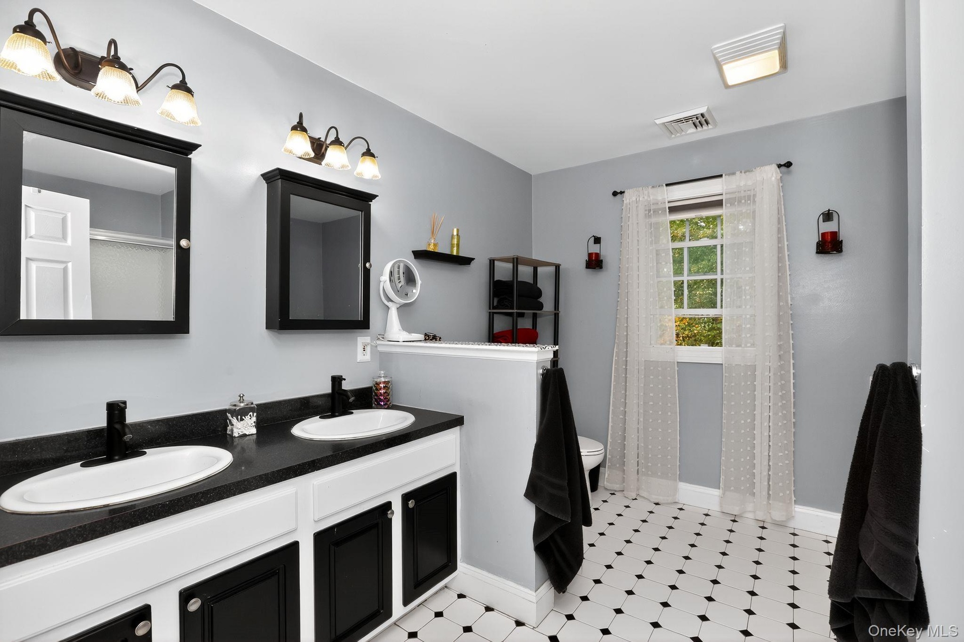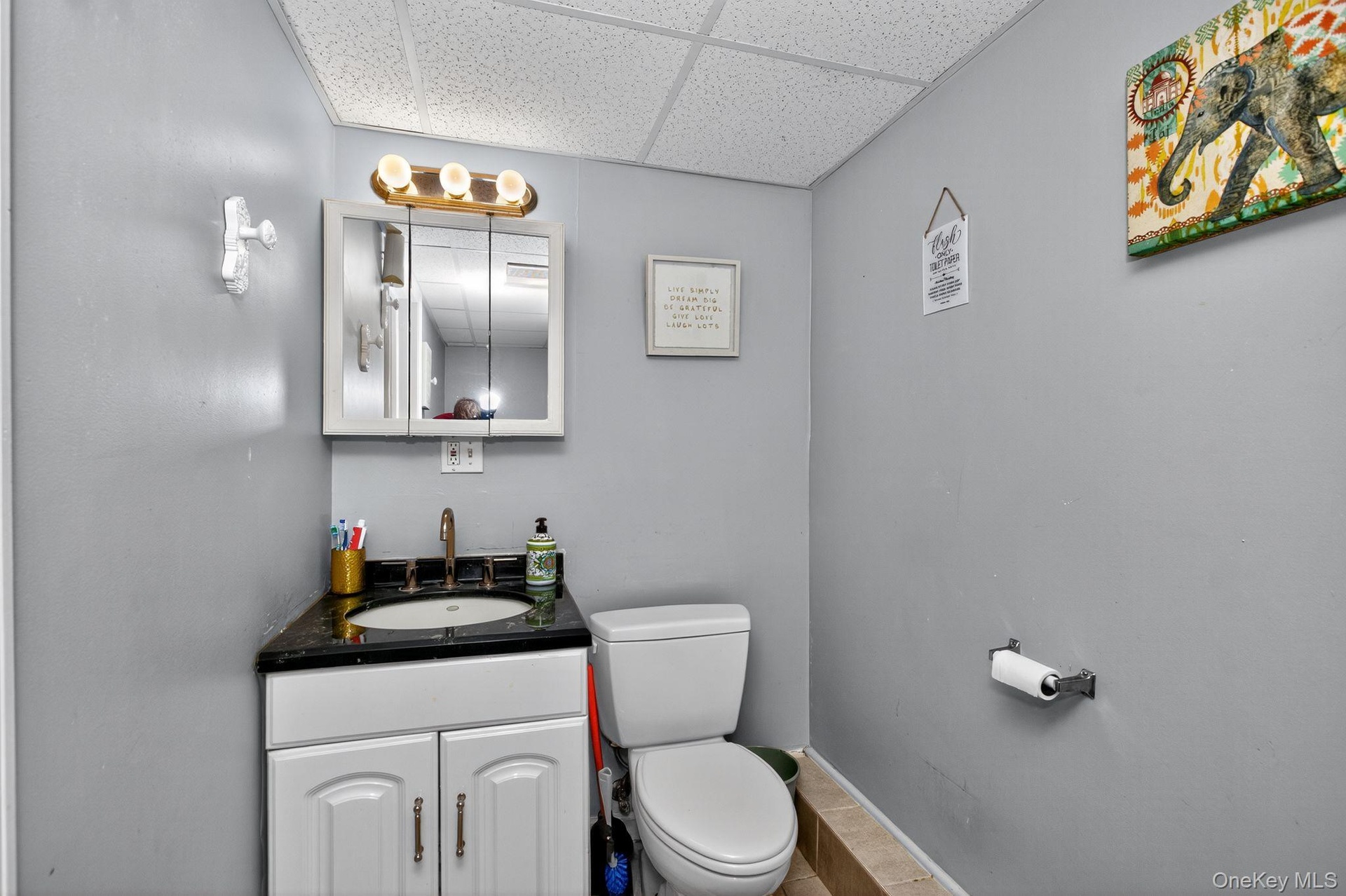 - Bathroom featuring a drop ceiling, vanity, and tile patterned floors