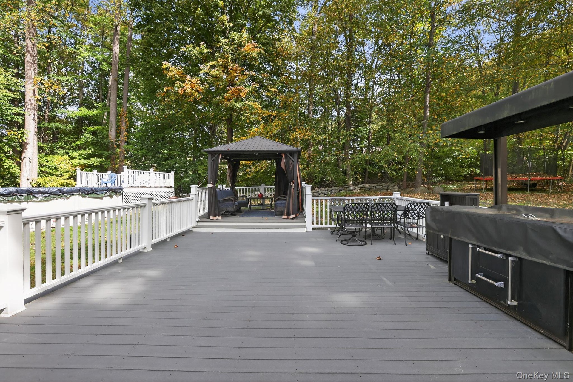 - Deck featuring a gazebo, view of wooded area, and a trampoline