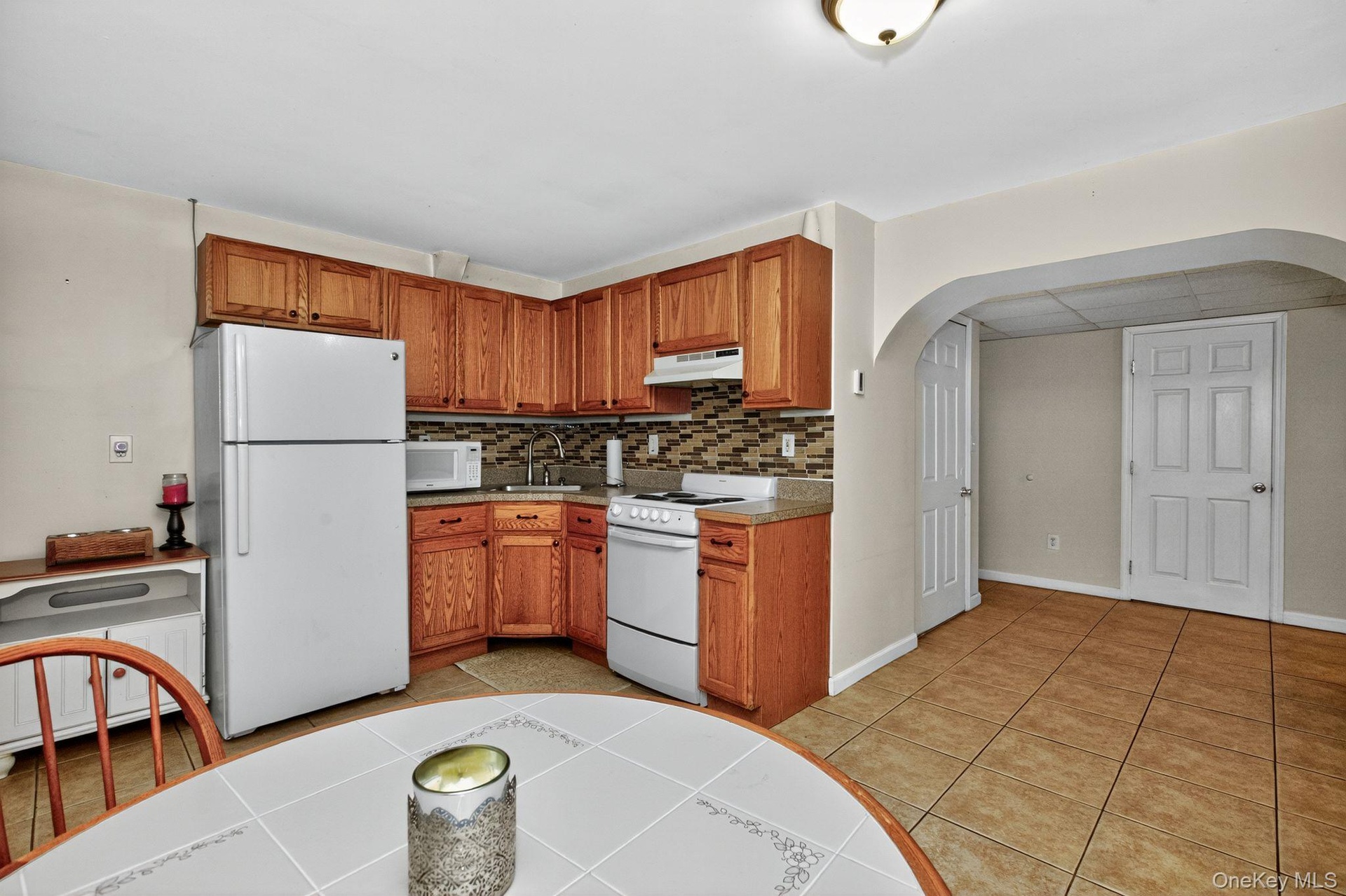- Kitchen with white appliances, light tile patterned floors, brown cabinets, and arched walkways