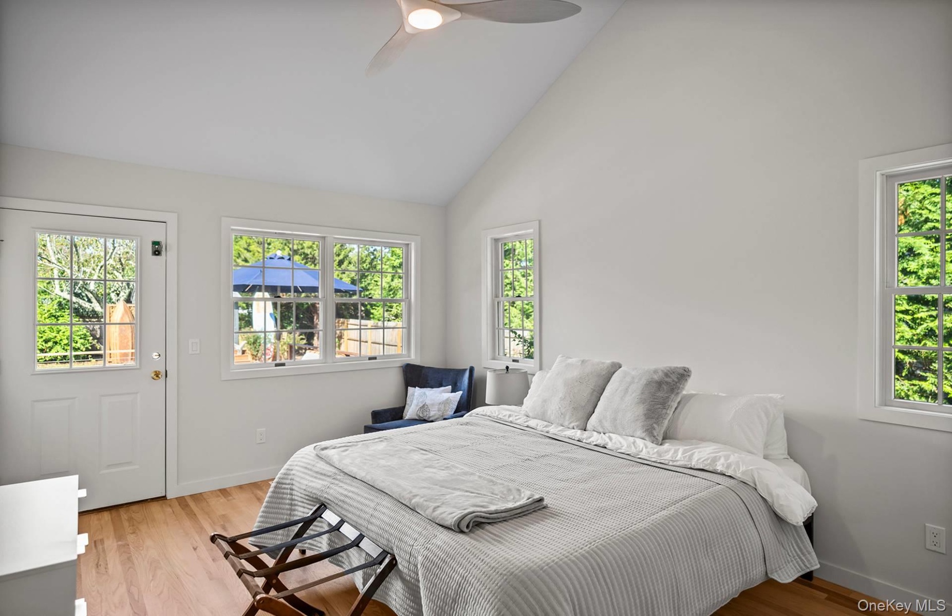 - Bedroom with light wood-style floors, high vaulted ceiling, and a ceiling fan