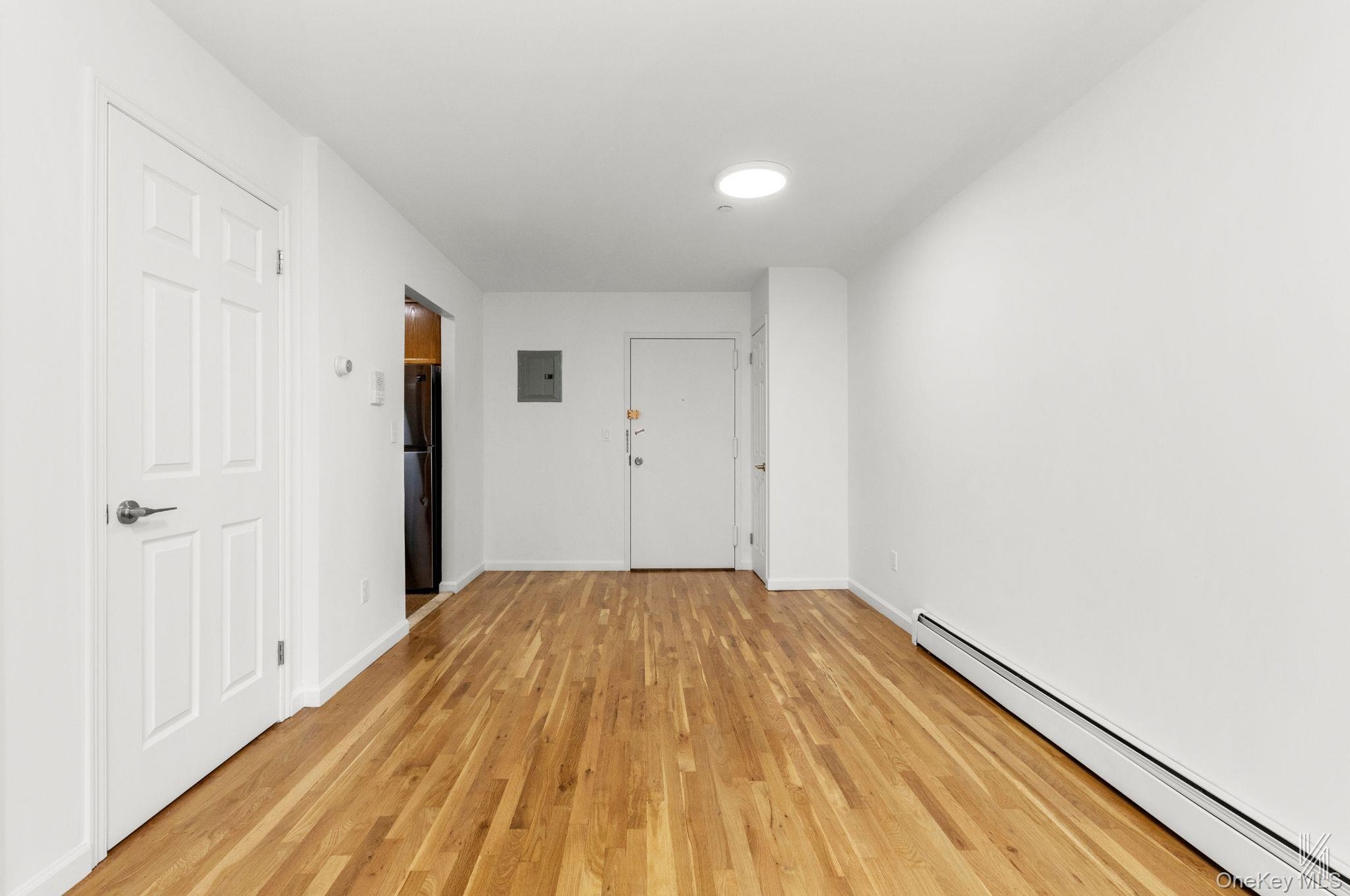 - Empty room with a baseboard heating unit, light wood-style floors, and electric panel