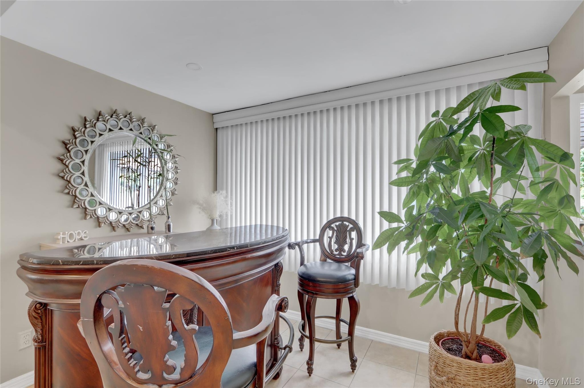 - Dining room featuring light tile patterned floors, a chandelier, and recessed lighting