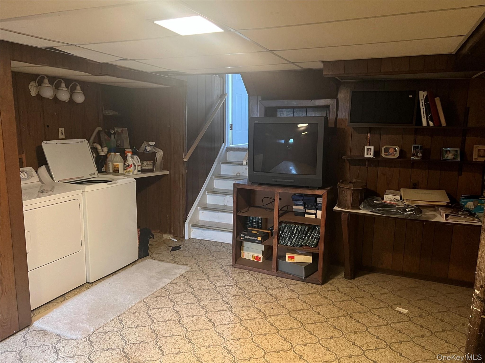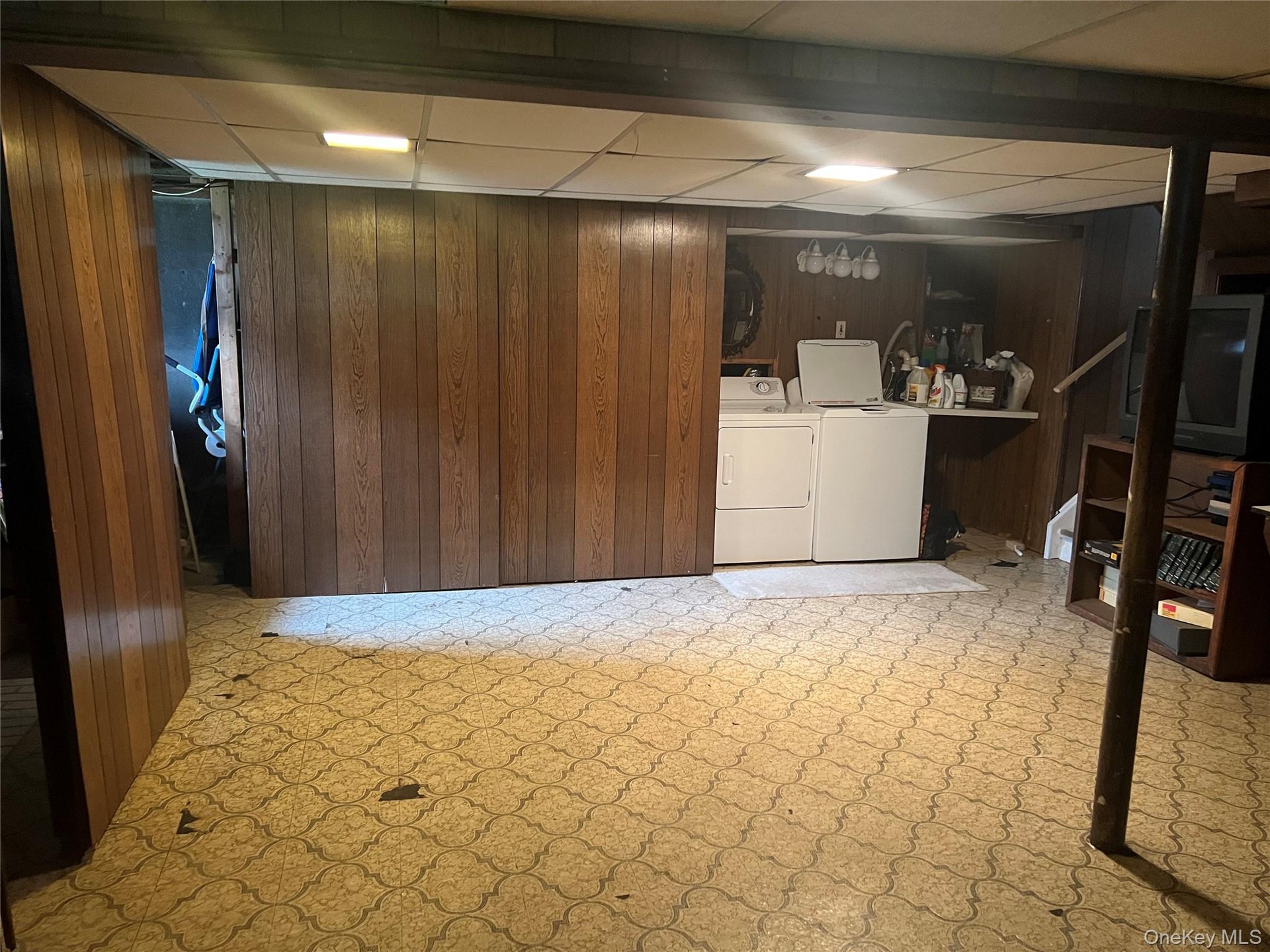 - Finished basement featuring a paneled ceiling, wooden walls, and washing machine and clothes dryer