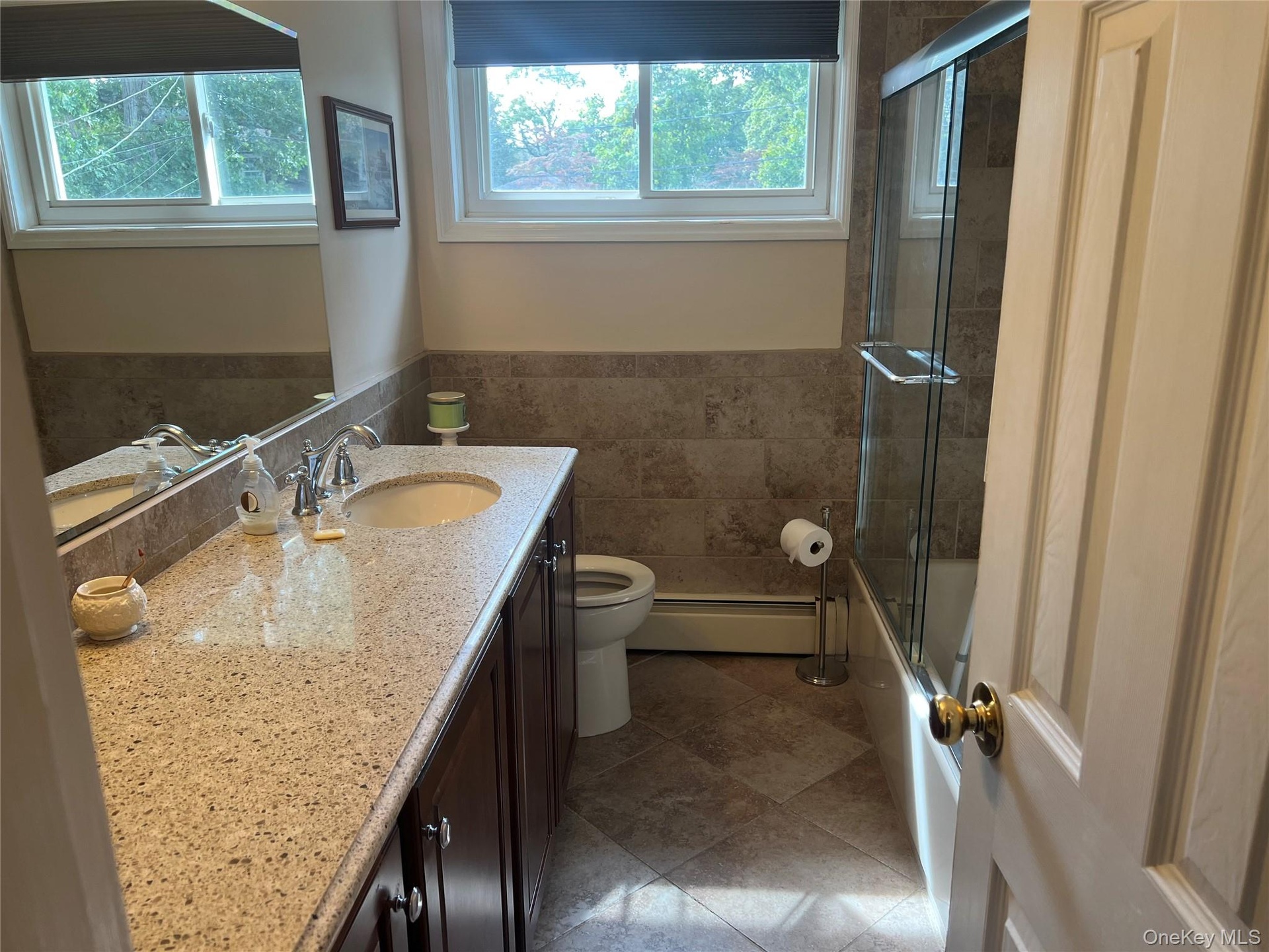 - Bathroom featuring vanity, enclosed tub / shower combo, tile walls, a baseboard radiator, and wainscoting