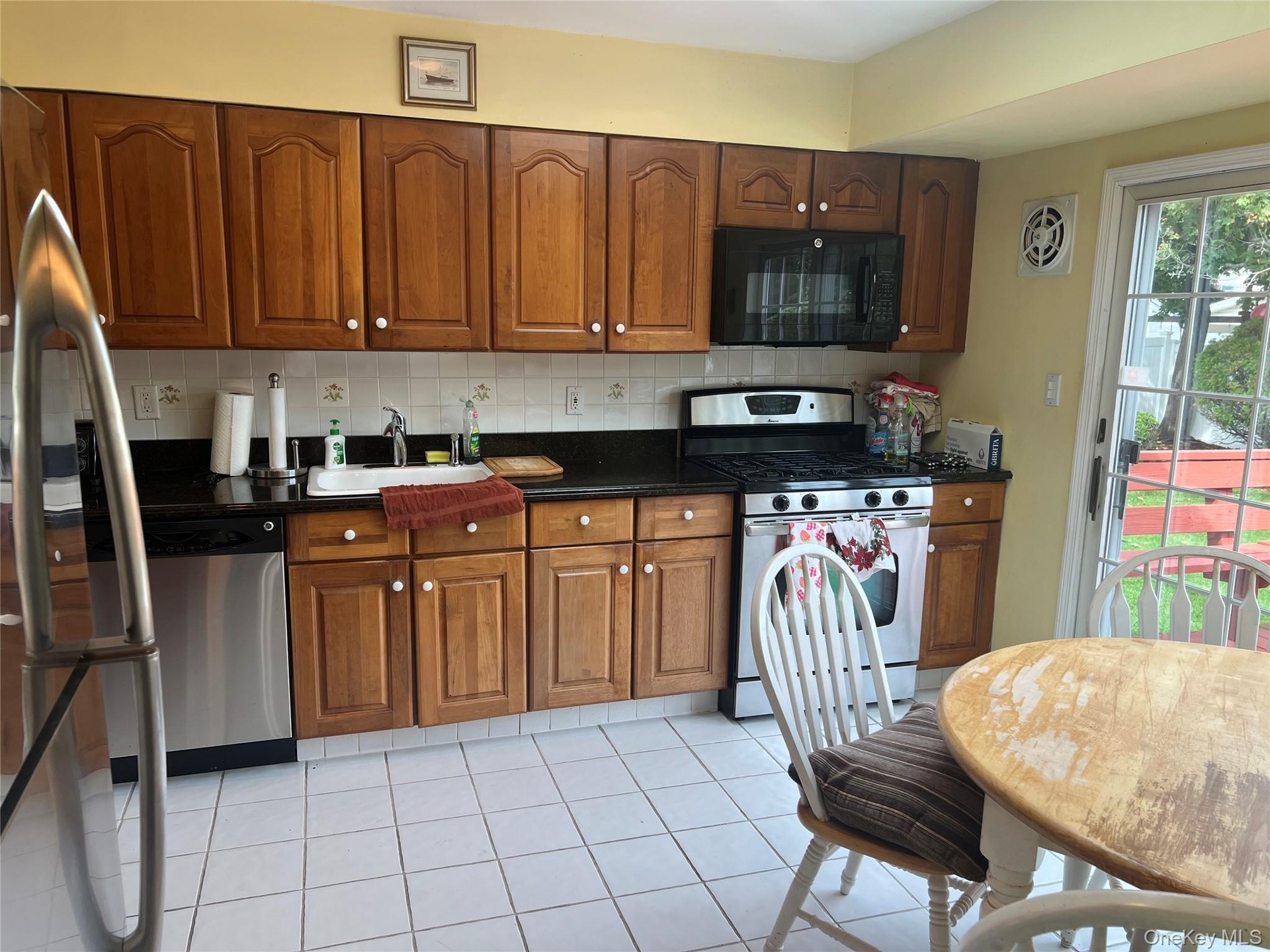 - Kitchen featuring stainless steel appliances, backsplash, brown cabinets, and light tile patterned floors