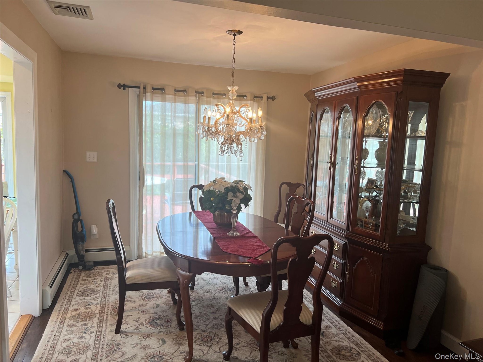 - Dining area featuring a chandelier, dark wood-style floors, and baseboard heating