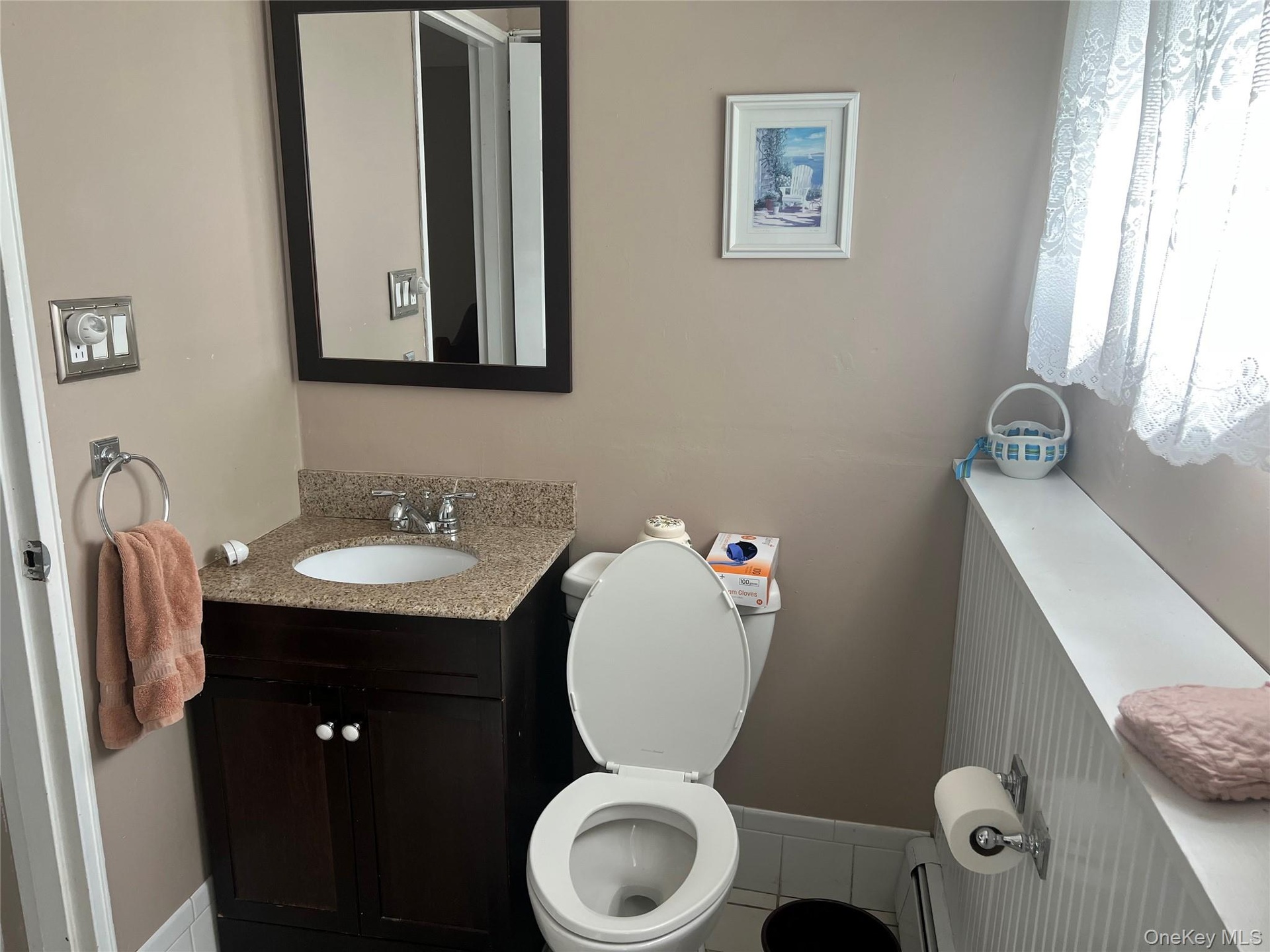 - Half bath featuring vanity, baseboard heating, and tile patterned flooring