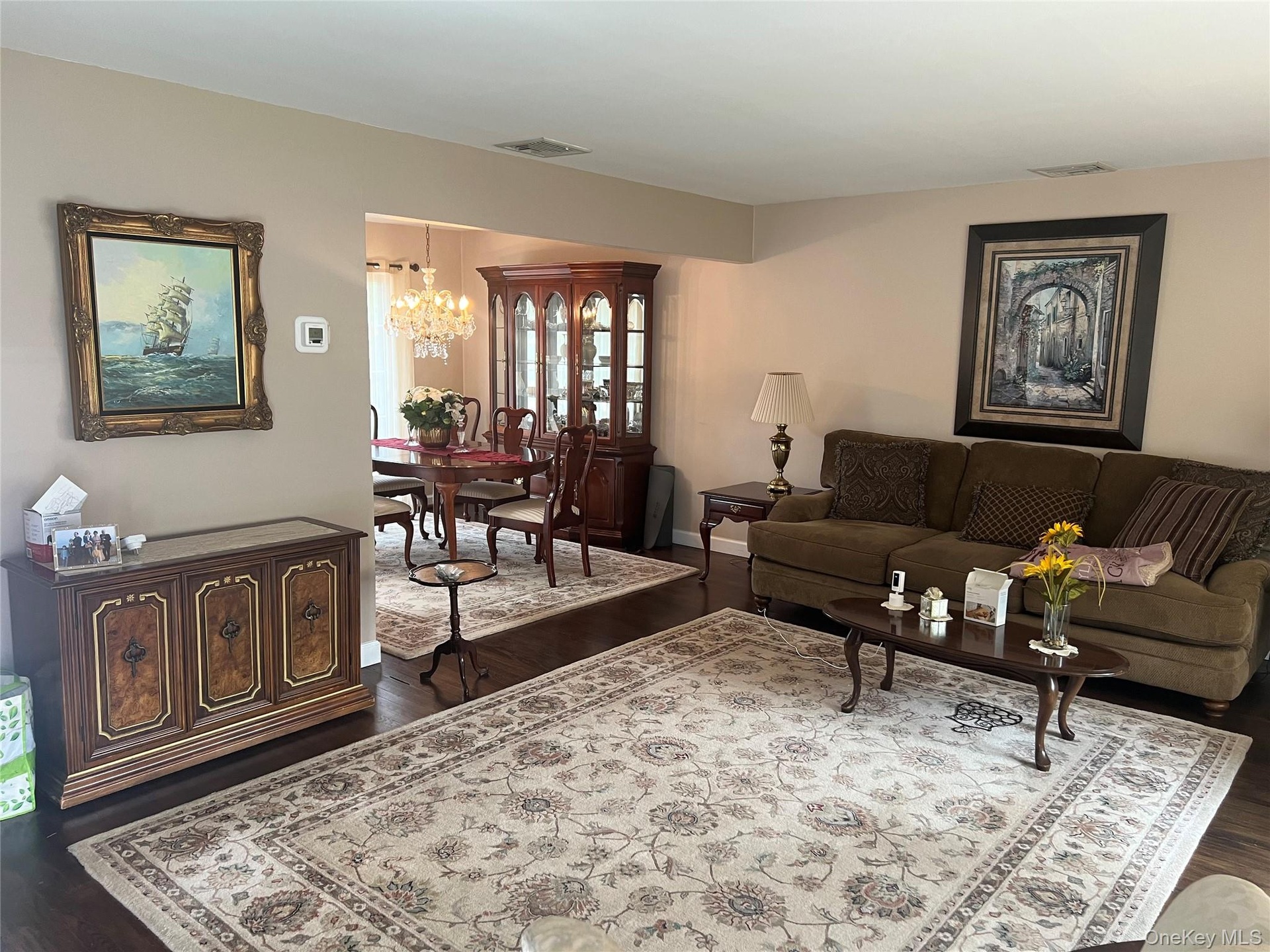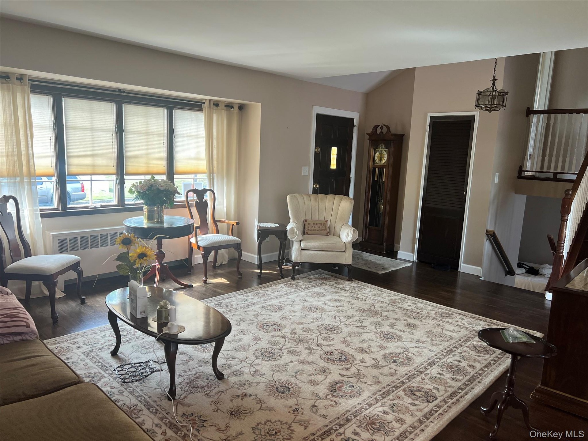 - Living room with radiator heating unit, dark wood-type flooring, and a chandelier