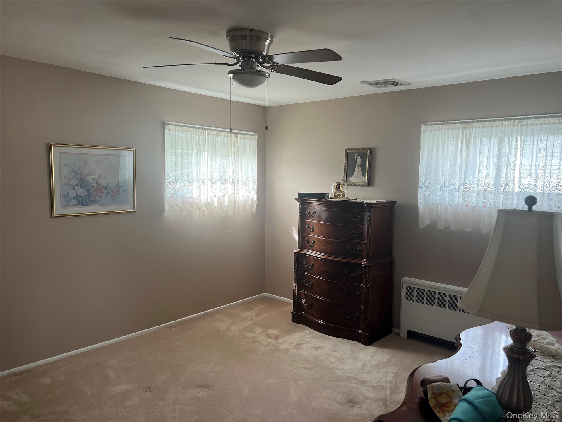 - Bedroom featuring radiator, carpet floors, and a ceiling fan