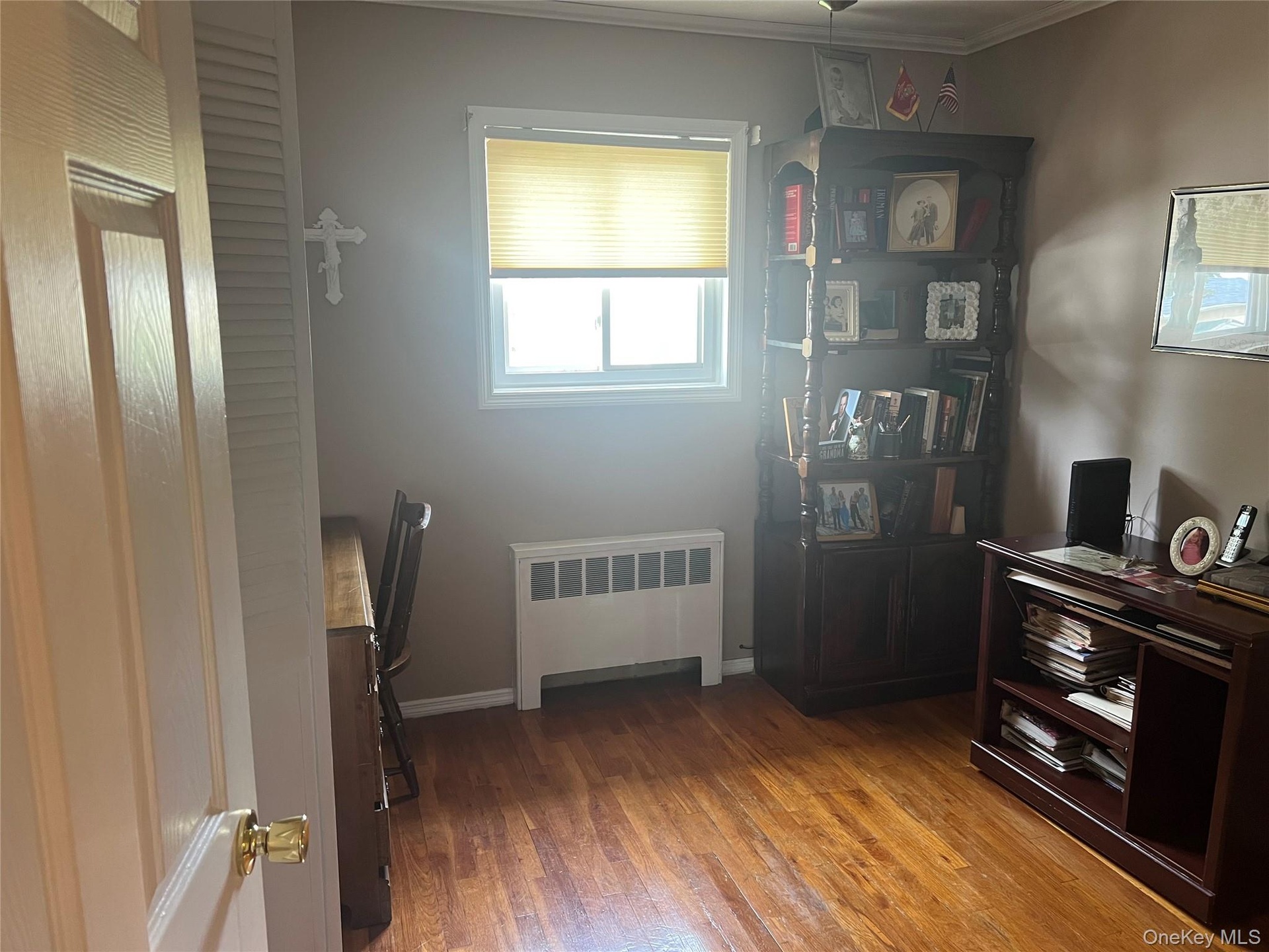 - Office area with radiator heating unit, wood finished floors, and crown molding