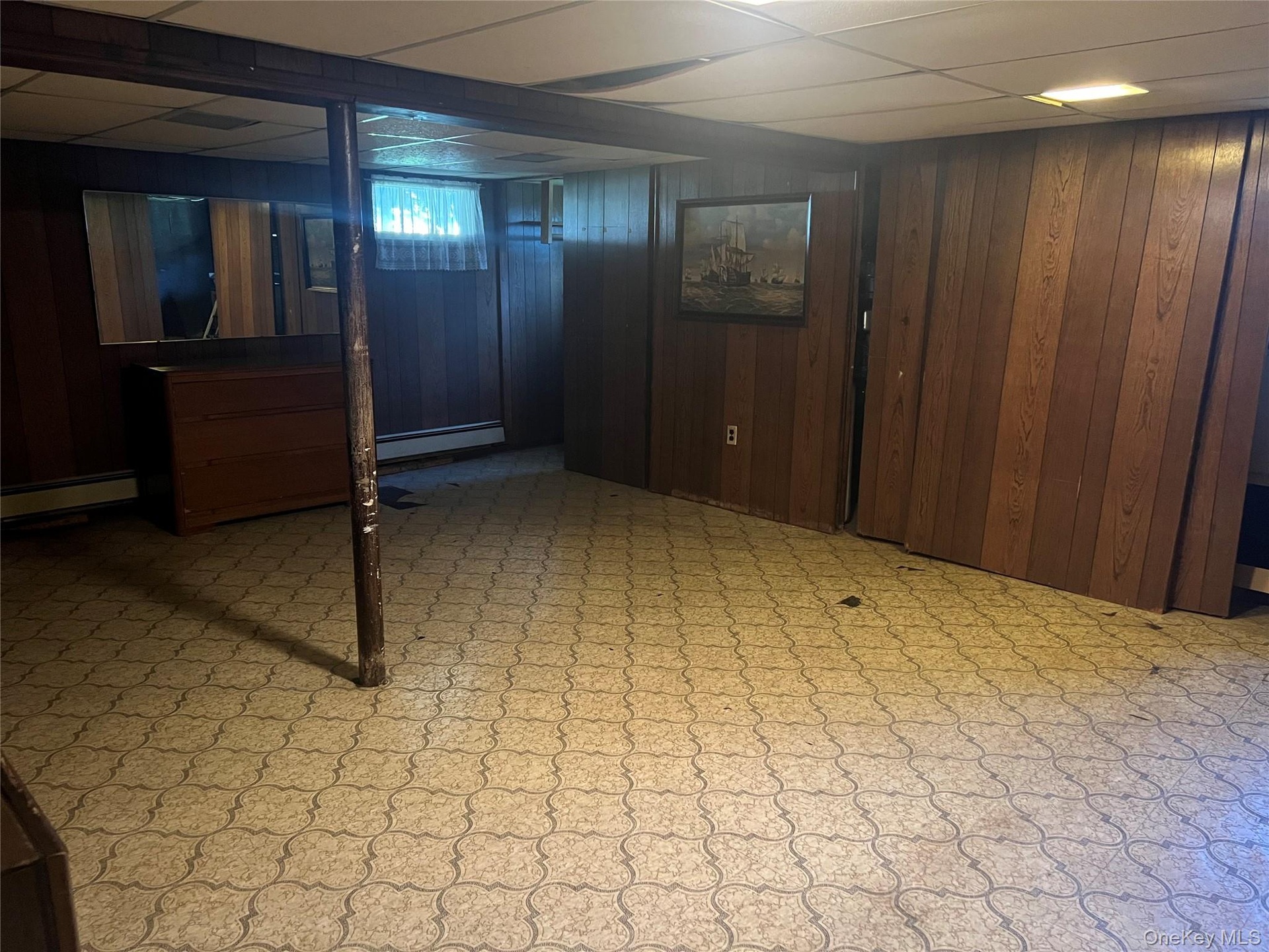 - Basement with a drop ceiling, wooden walls, light floors, and a baseboard radiator