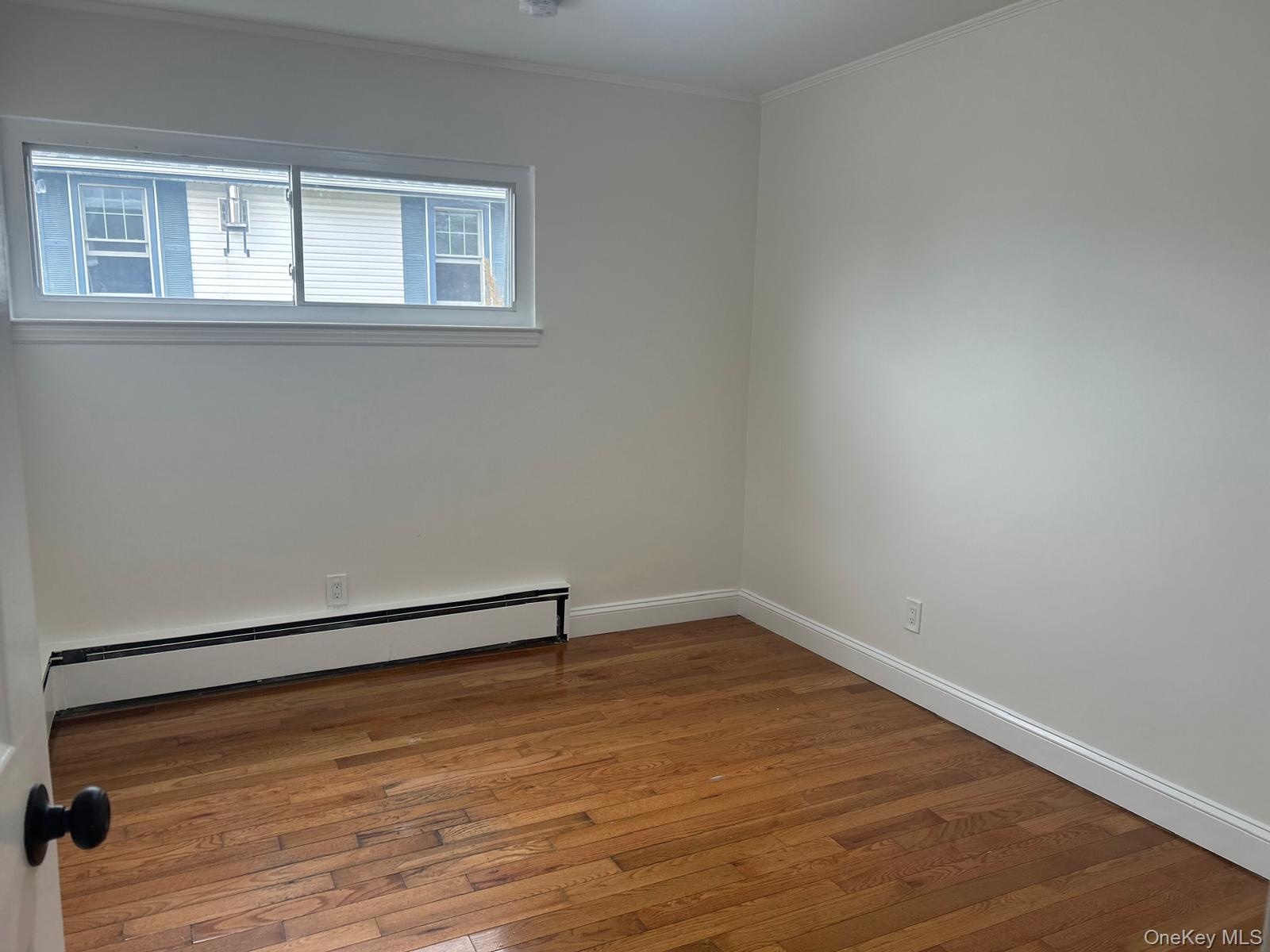 - Empty room with wood-type flooring, baseboard heating, and ornamental molding