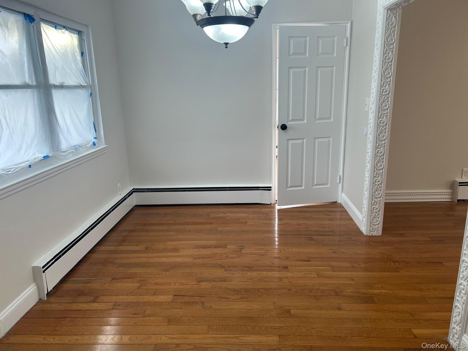 - Unfurnished dining area with baseboard heating, wood-type flooring, and a chandelier