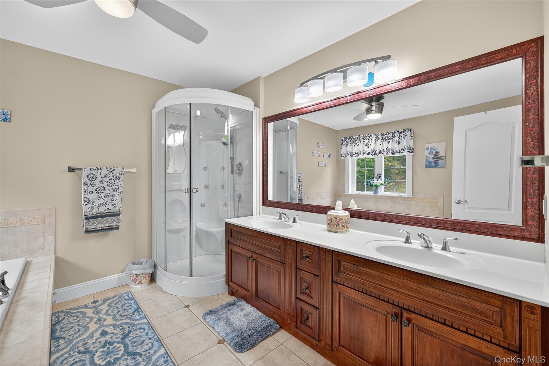 - Full bath featuring a ceiling fan, a shower stall, double vanity, a garden tub, and light tile patterned floors