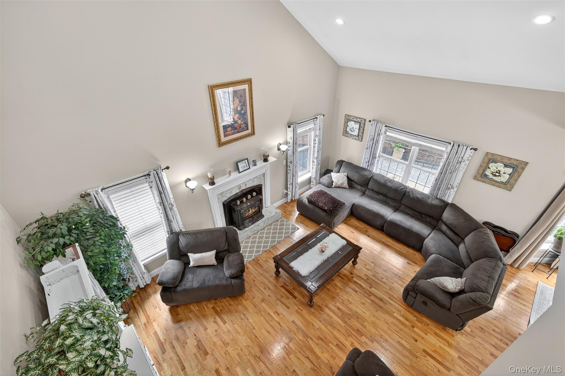 - Living room featuring high vaulted ceiling, a lit fireplace, light wood-type flooring, recessed lighting, and a decorative wall