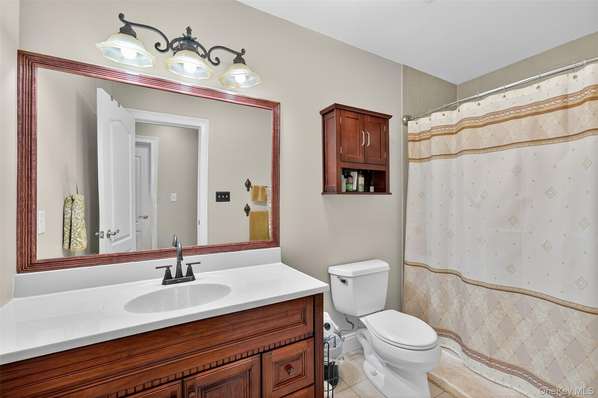 - Full bathroom featuring vanity, light tile patterned flooring, and a shower with curtain