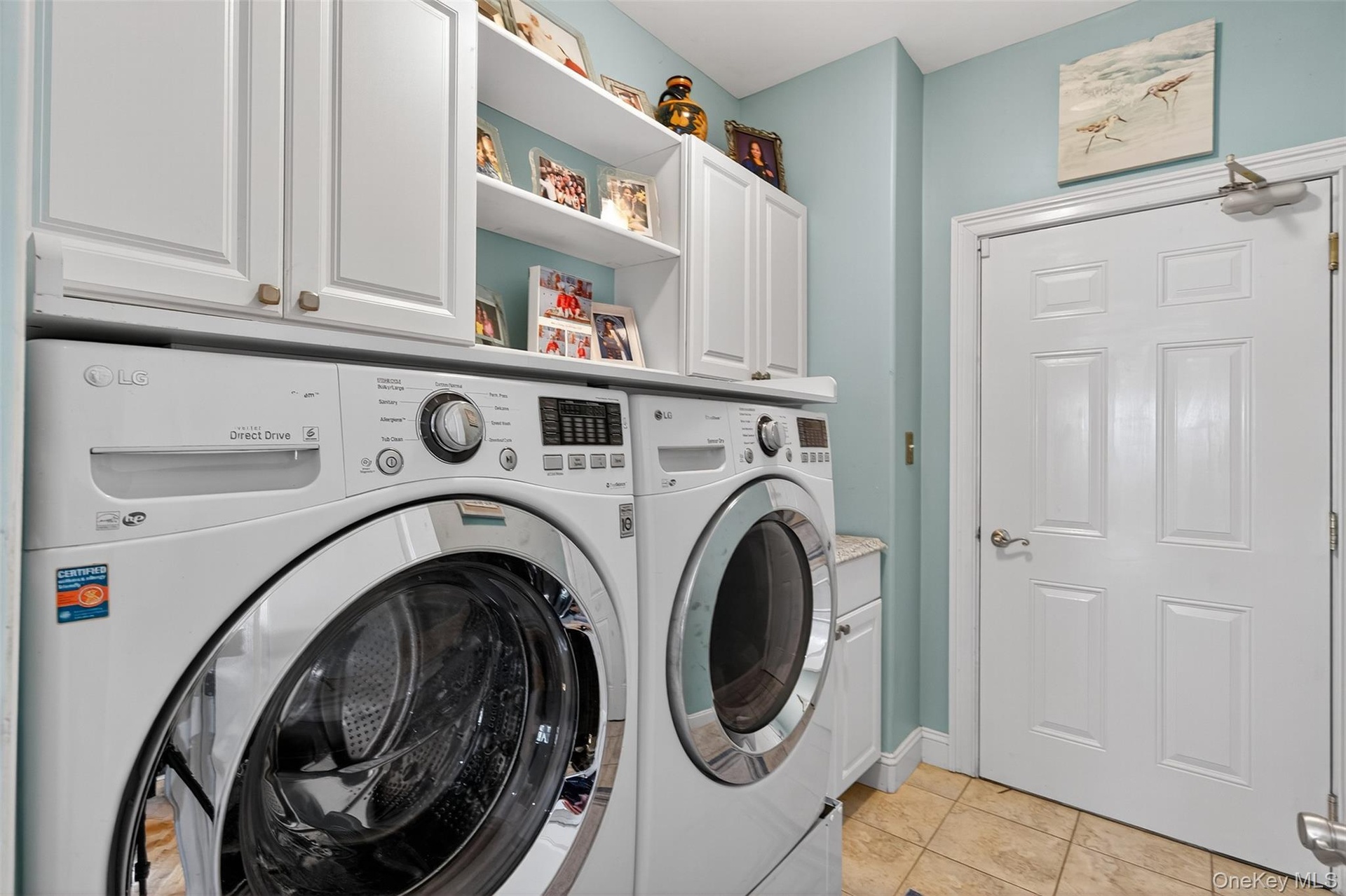 - Laundry room featuring light tile patterned flooring, washer and dryer, and cabinet space