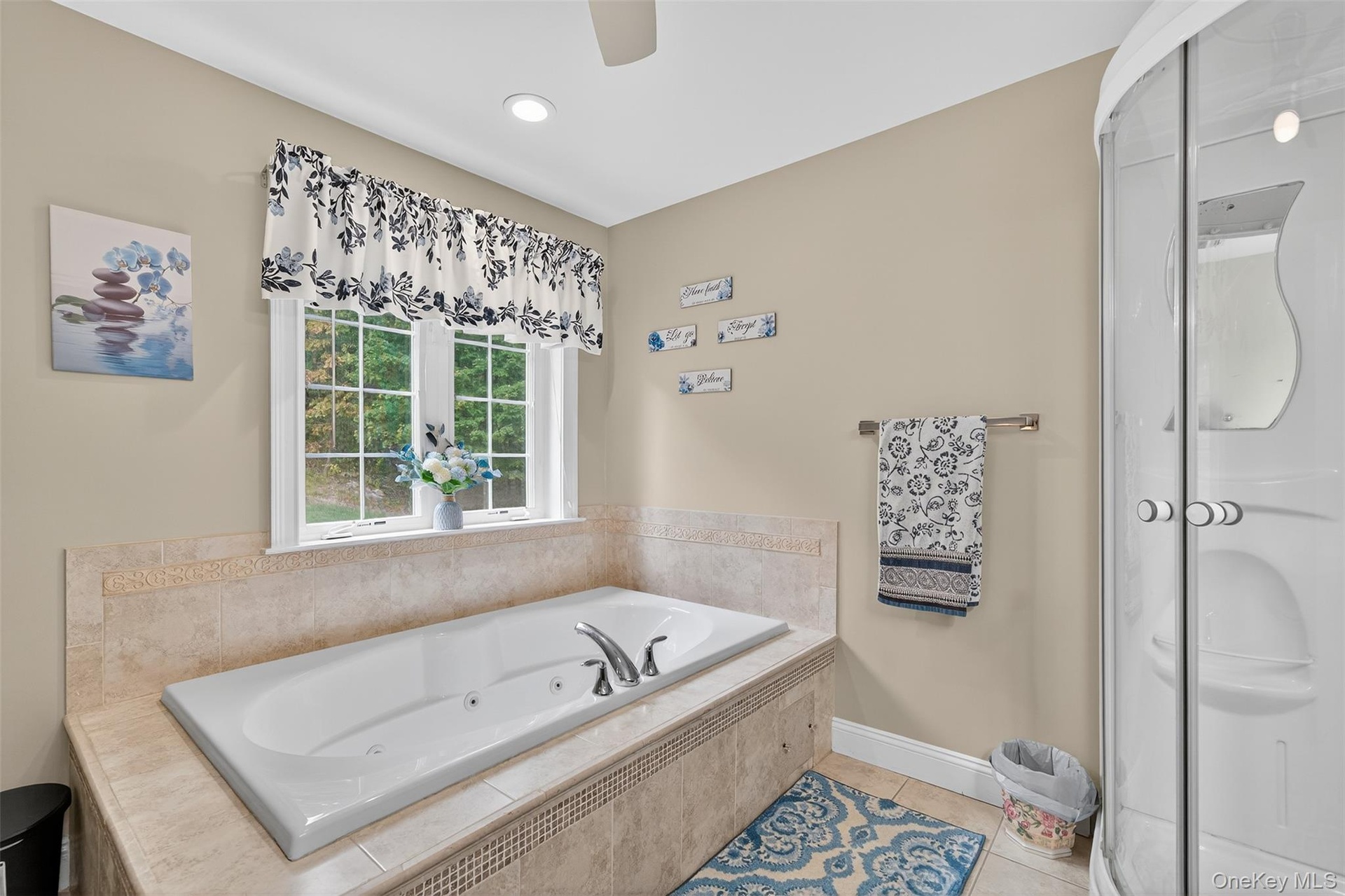 - Bathroom with a whirlpool tub, light tile patterned flooring, and a shower stall