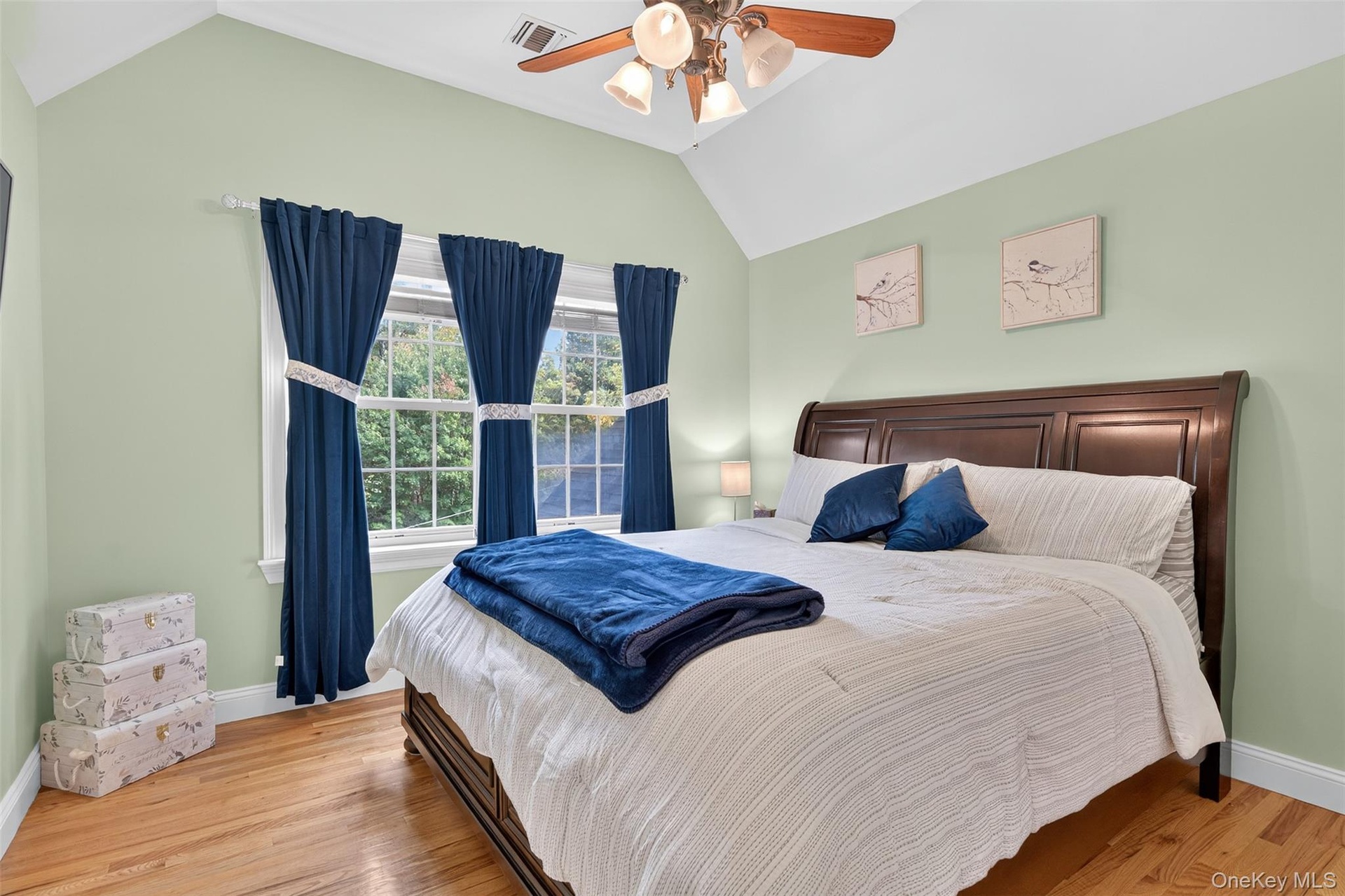 - Bedroom with vaulted ceiling, light wood-style flooring, and a ceiling fan