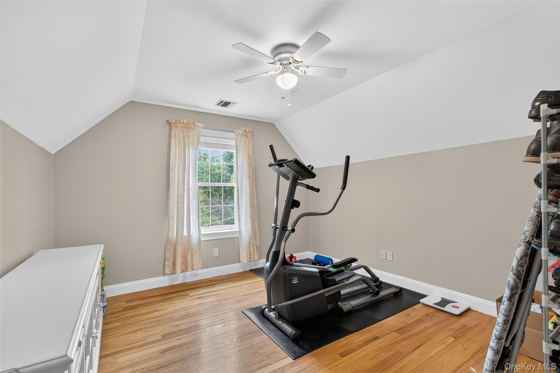 - Exercise area with vaulted ceiling, light wood-style flooring, and ceiling fan