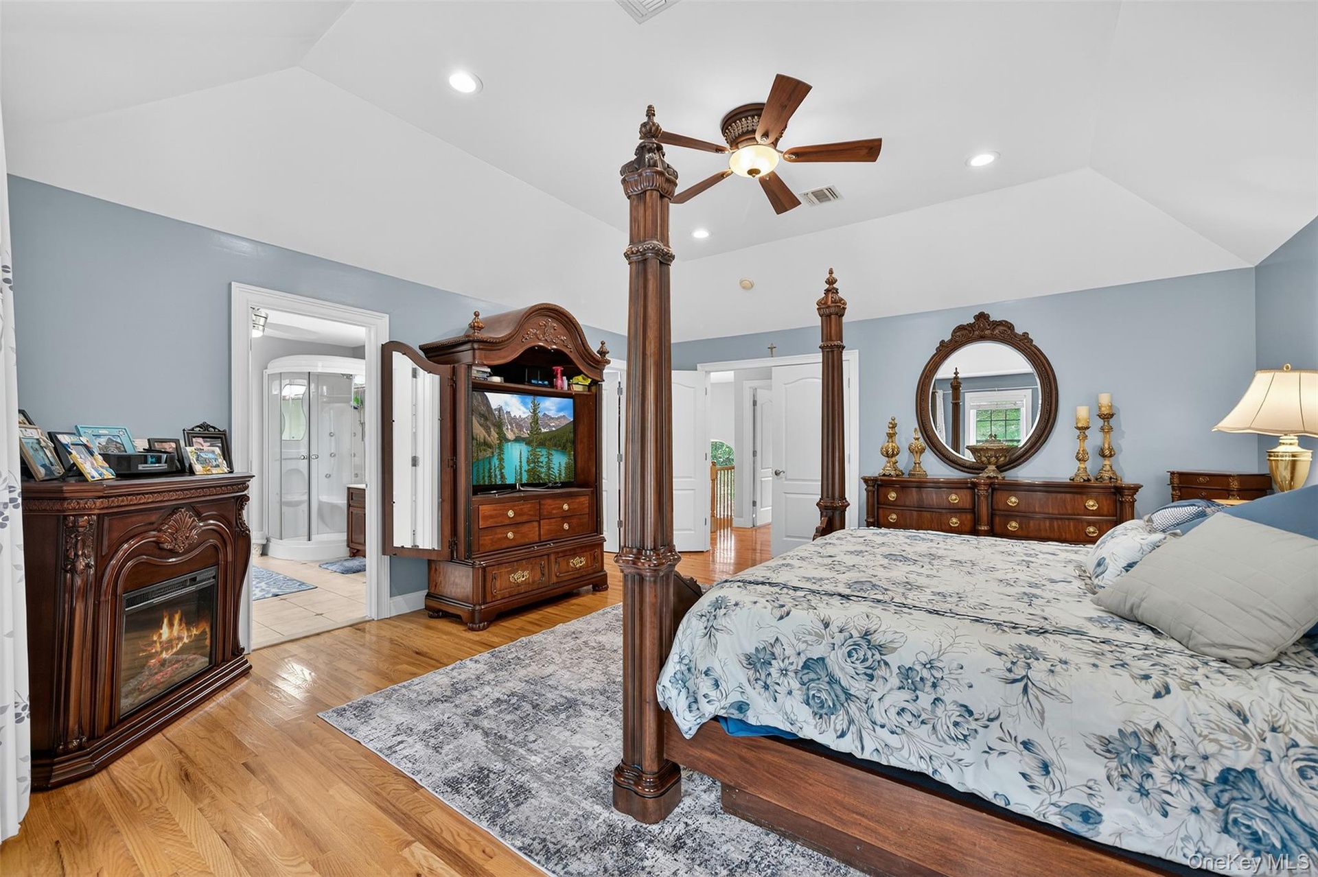 - Bedroom with light wood-type flooring, vaulted ceiling, ceiling fan, recessed lighting, and a glass covered fireplace