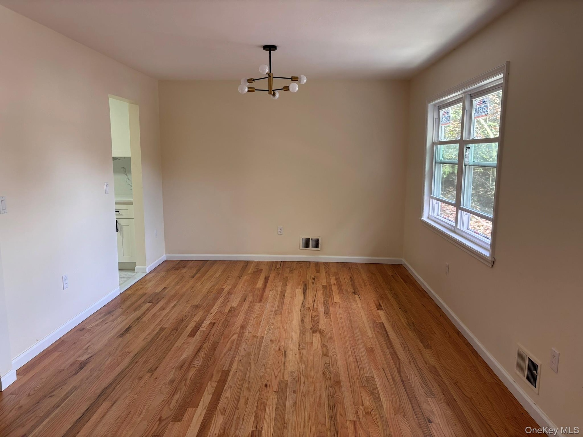 - Unfurnished dining area with a chandelier and light wood-style flooring