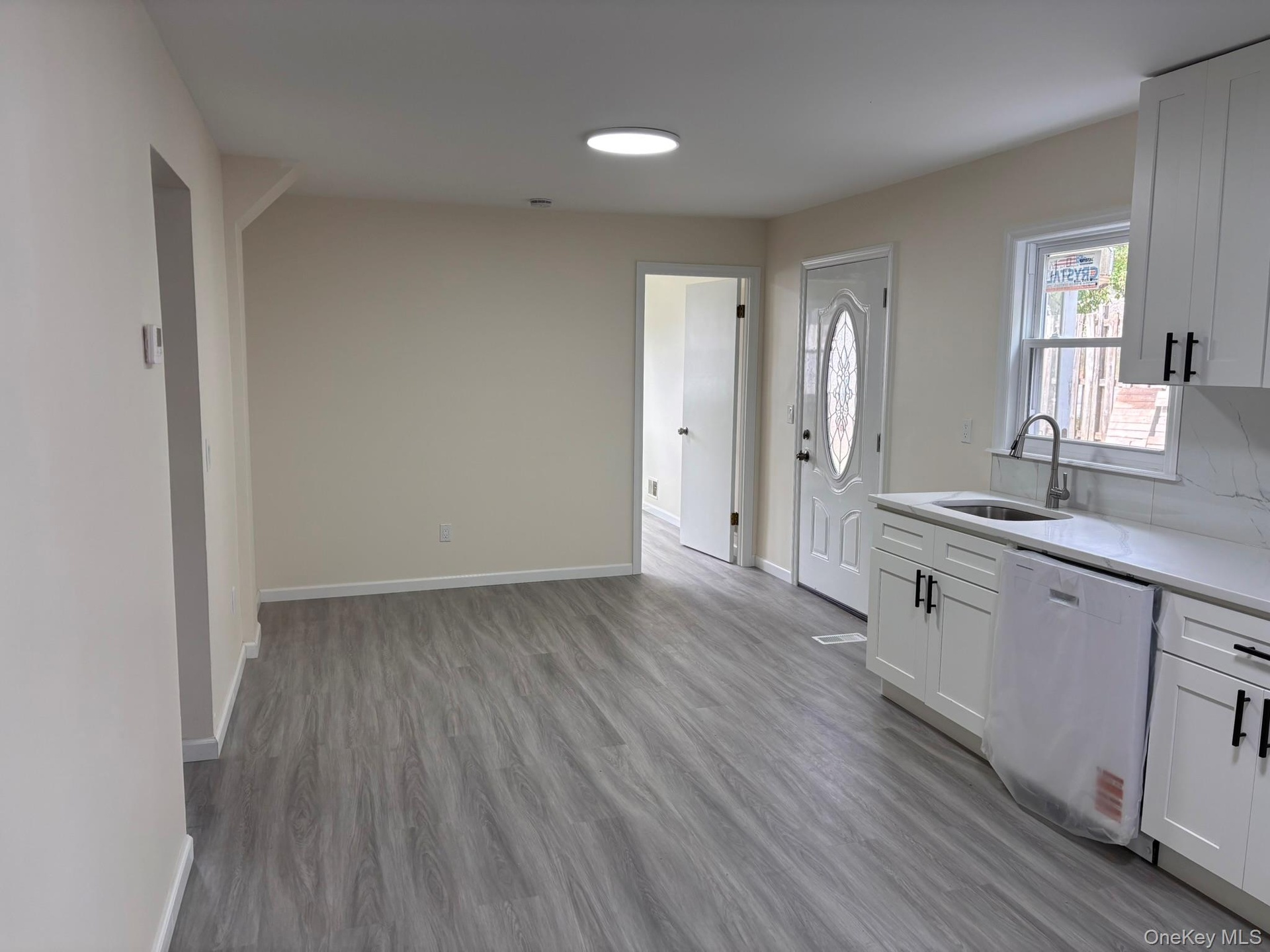 - Kitchen with white cabinets, light wood-style flooring, dishwasher, and light stone countertops