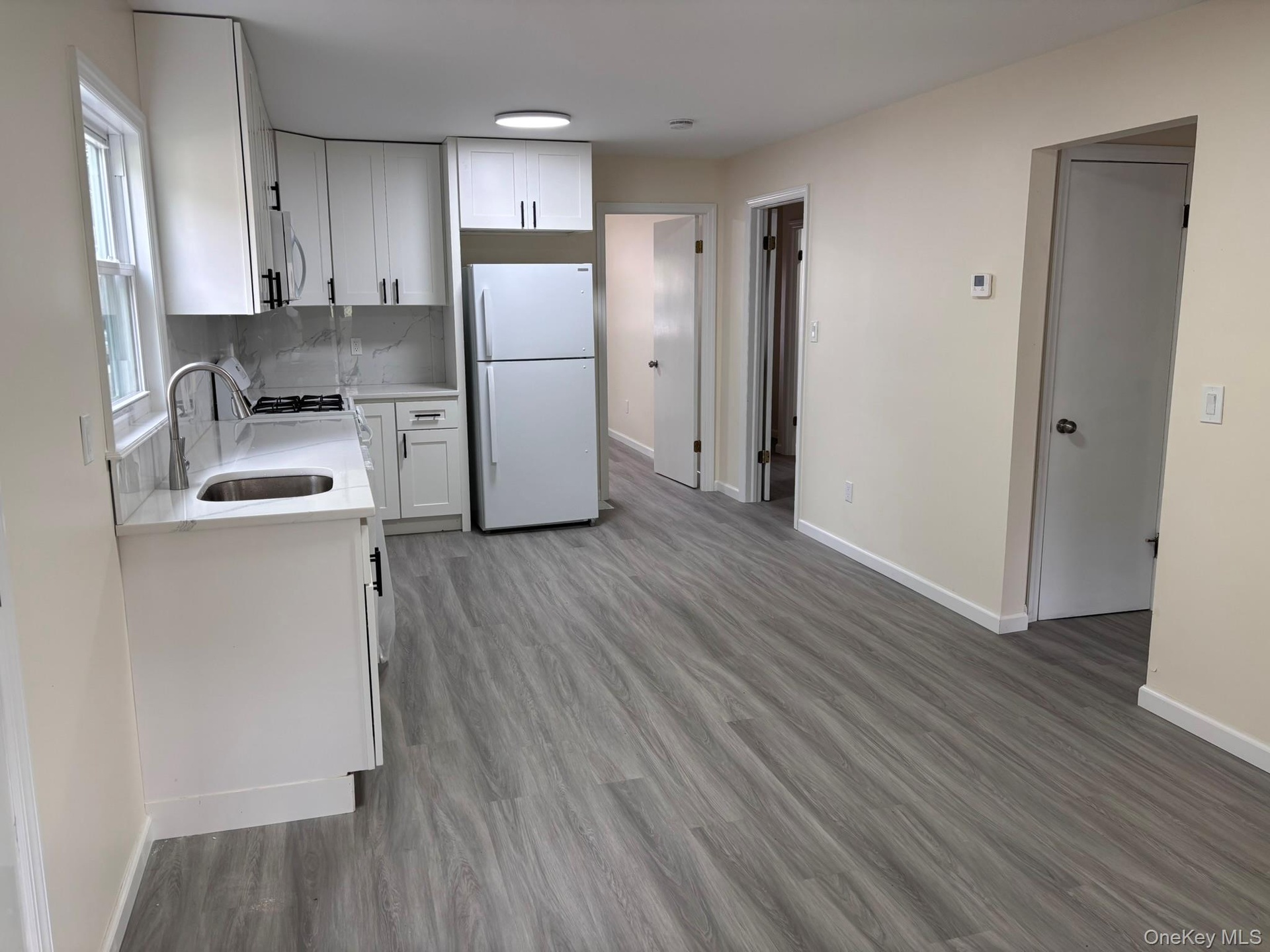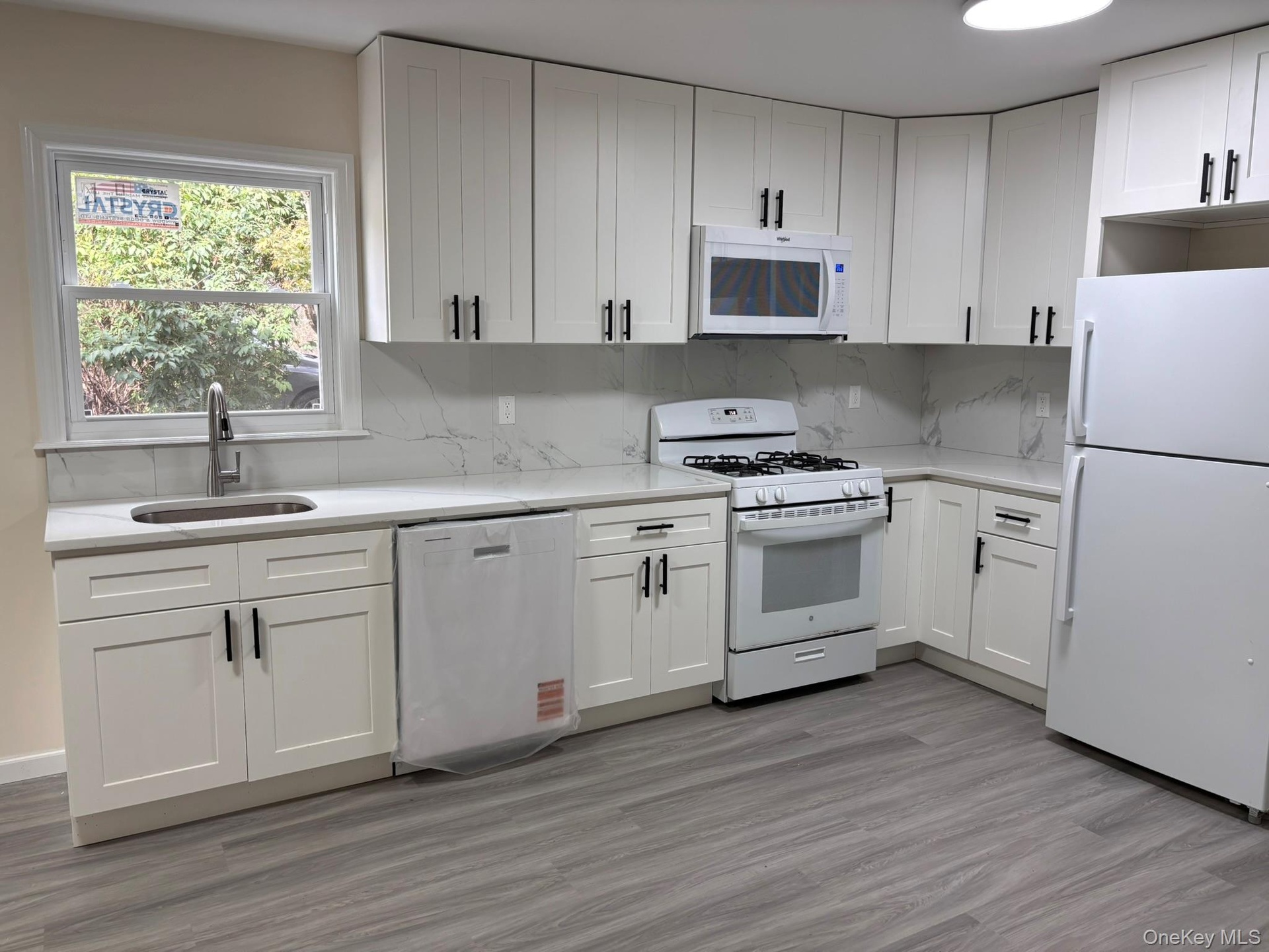 - Kitchen featuring white appliances, white cabinets, decorative backsplash, and light wood-type flooring