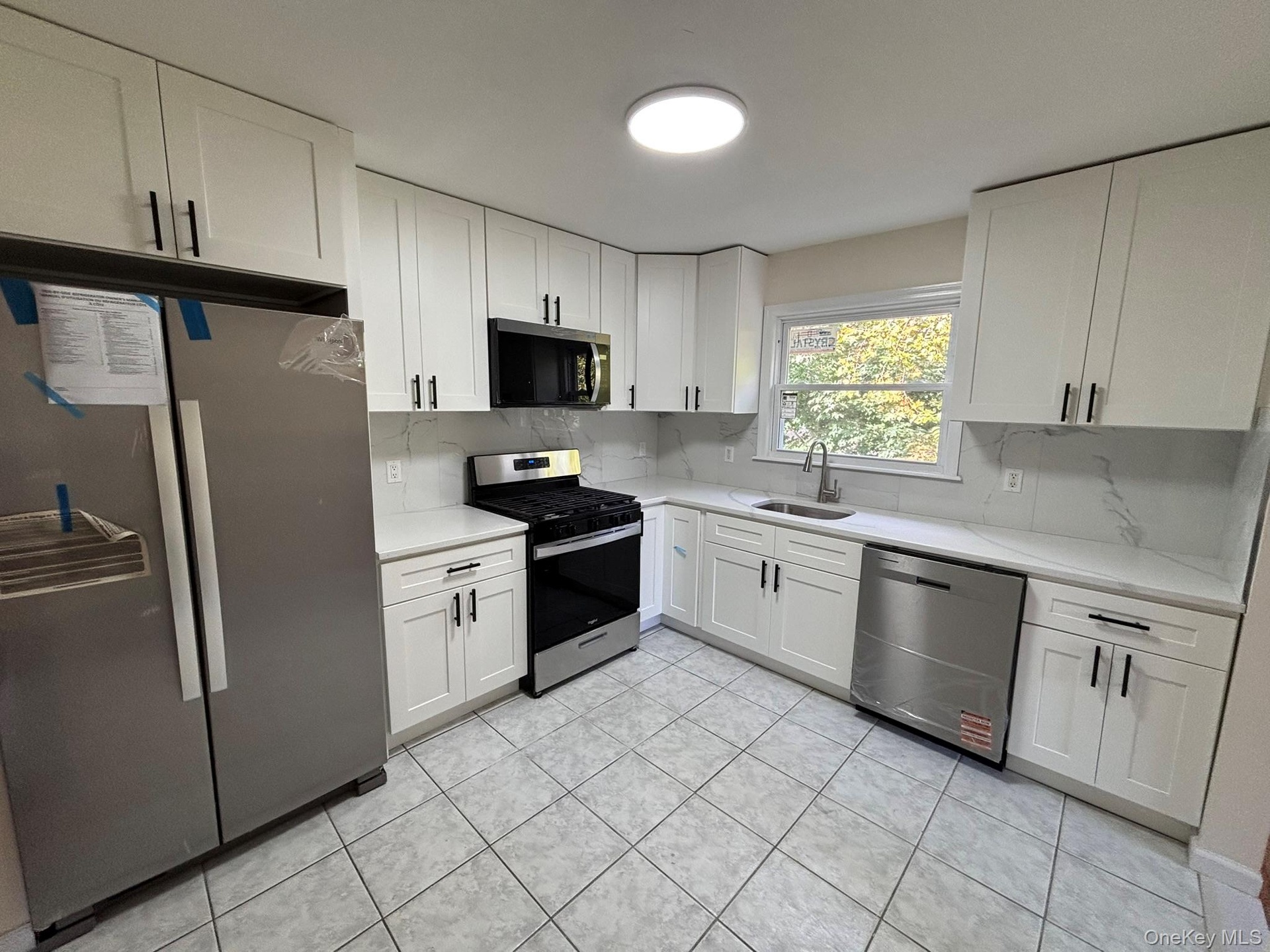 - Kitchen featuring stainless steel appliances, white cabinetry, tasteful backsplash, and light tile patterned floors