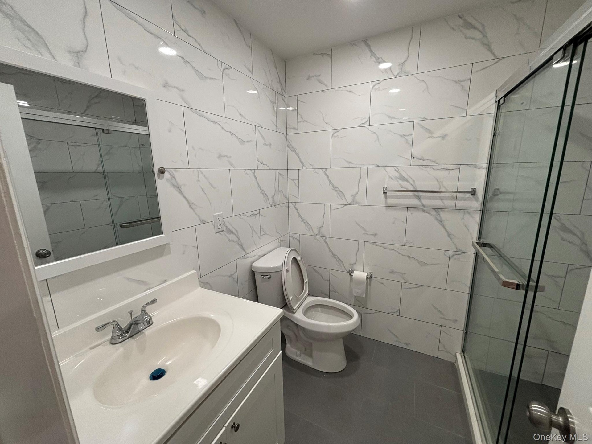 - Bathroom featuring tile walls, vanity, and a stall shower