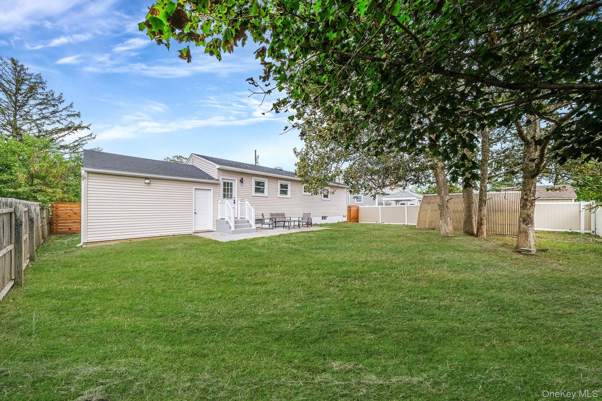 - Fenced backyard with an outbuilding, a patio area, and a greenhouse
