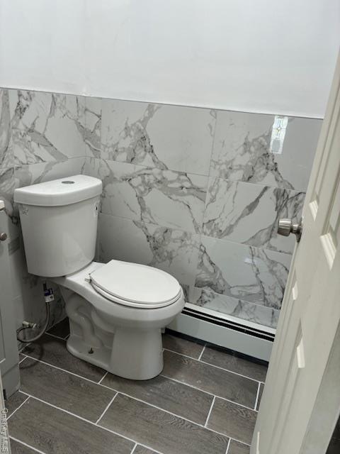 - Bathroom featuring a baseboard heating unit, tile walls, wood tiled floors, and wainscoting