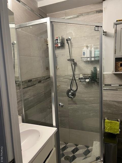 - Bathroom with tile walls, a stall shower, dark tile patterned flooring, and wainscoting