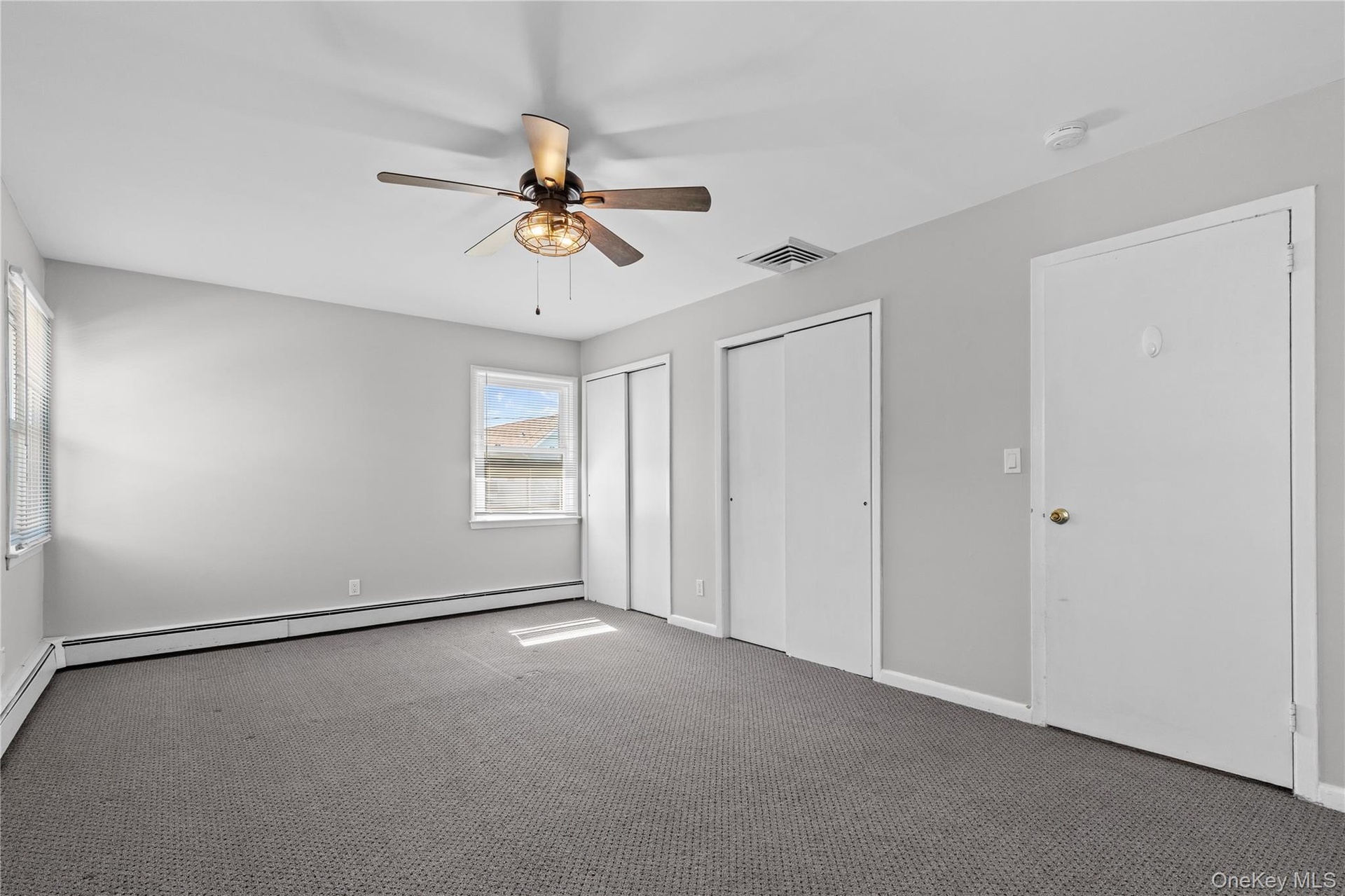 - Unfurnished bedroom featuring two closets, carpet flooring, a ceiling fan, and a baseboard heating unit
