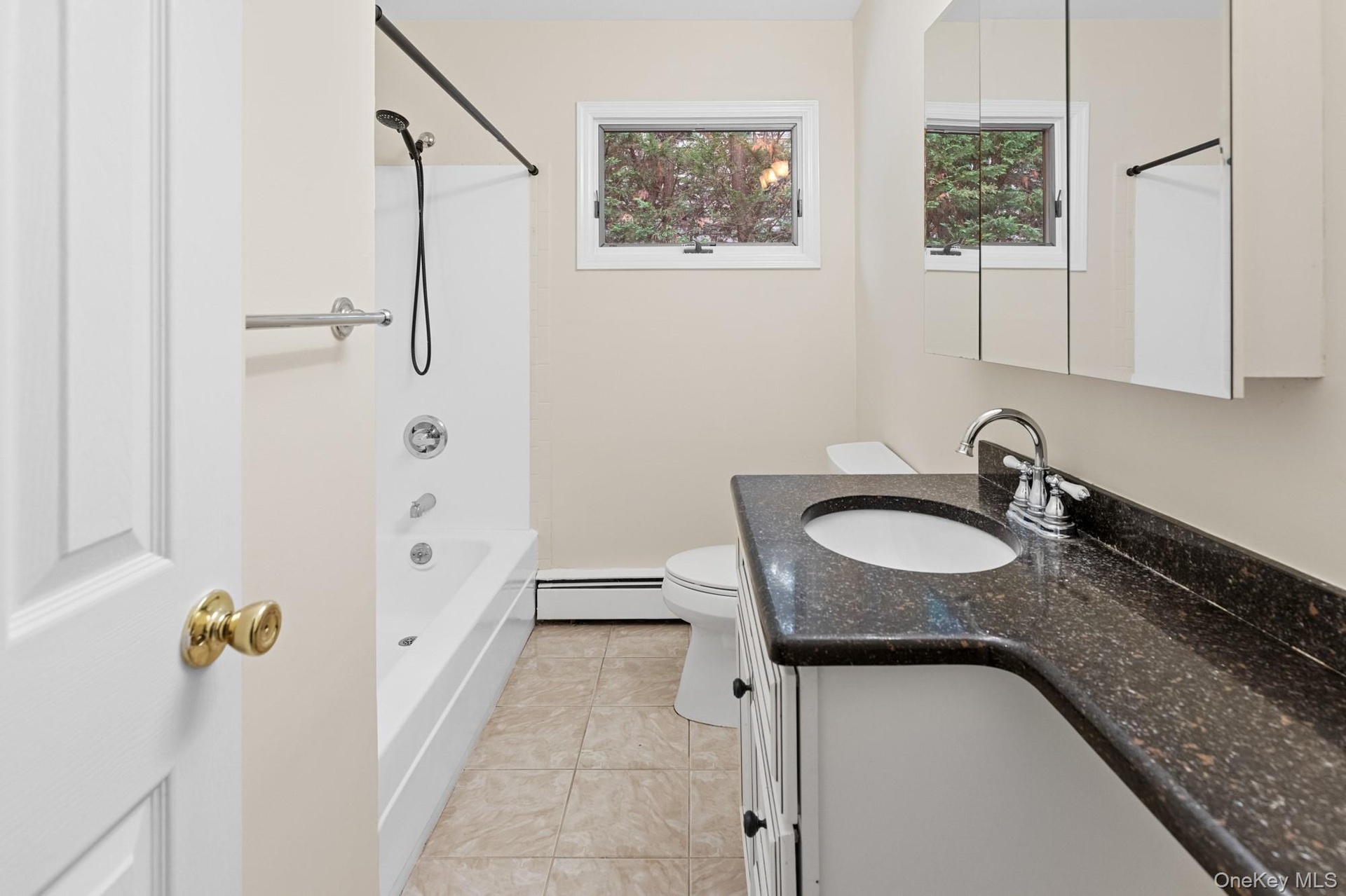 - Bathroom with shower / tub combination, healthy amount of natural light, vanity, and a baseboard radiator