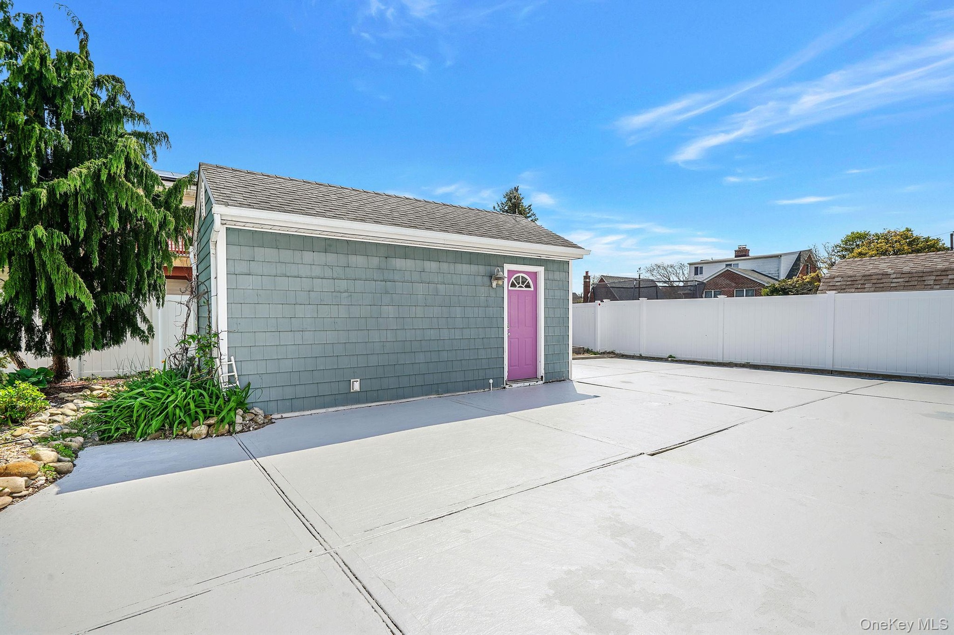 - View of front of home featuring an outdoor structure, a garage, fence, a porch, and driveway