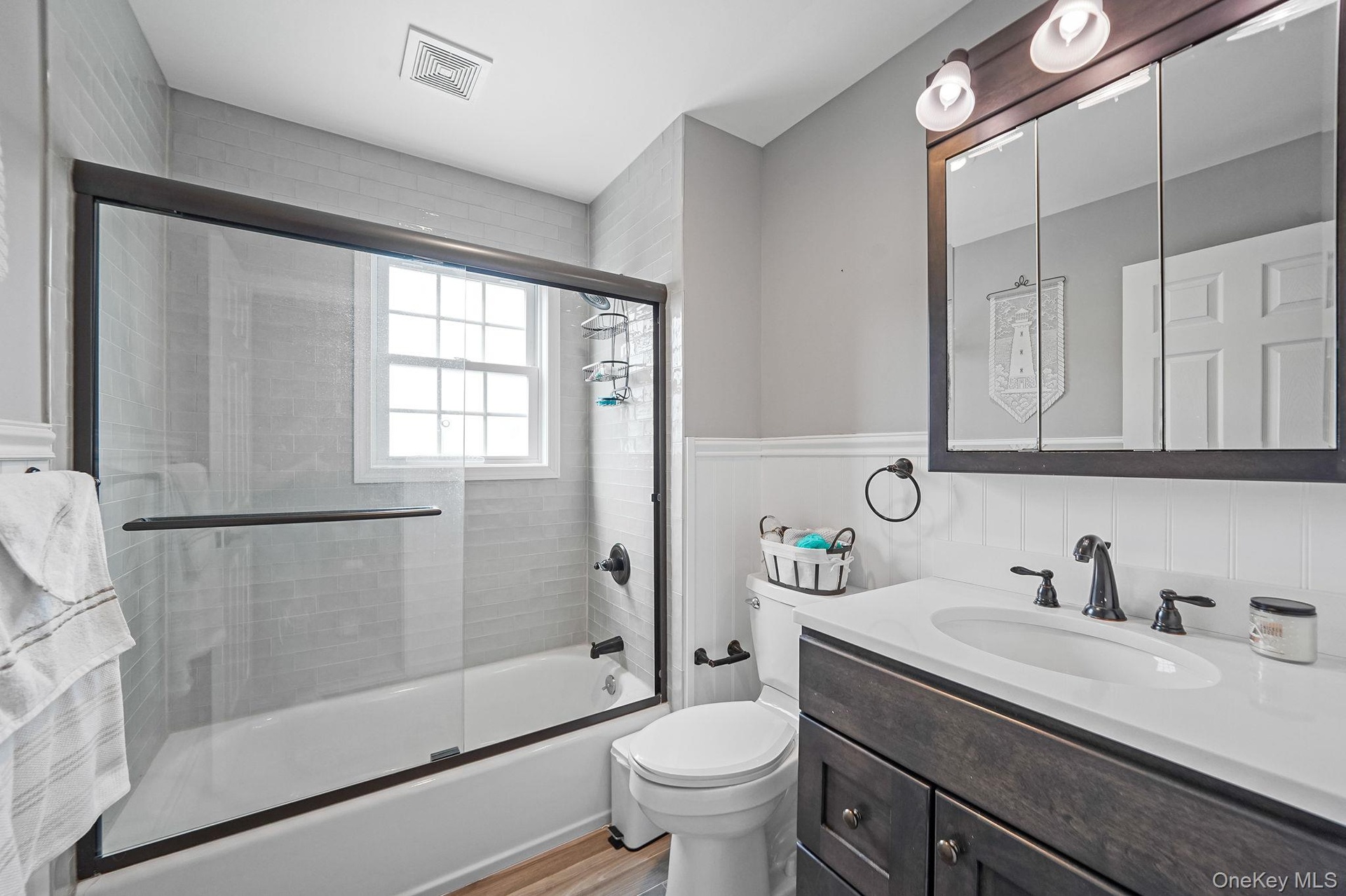 - Full bath featuring visible vents, vanity, wood finished floors, shower / bath combination with glass door, and toilet