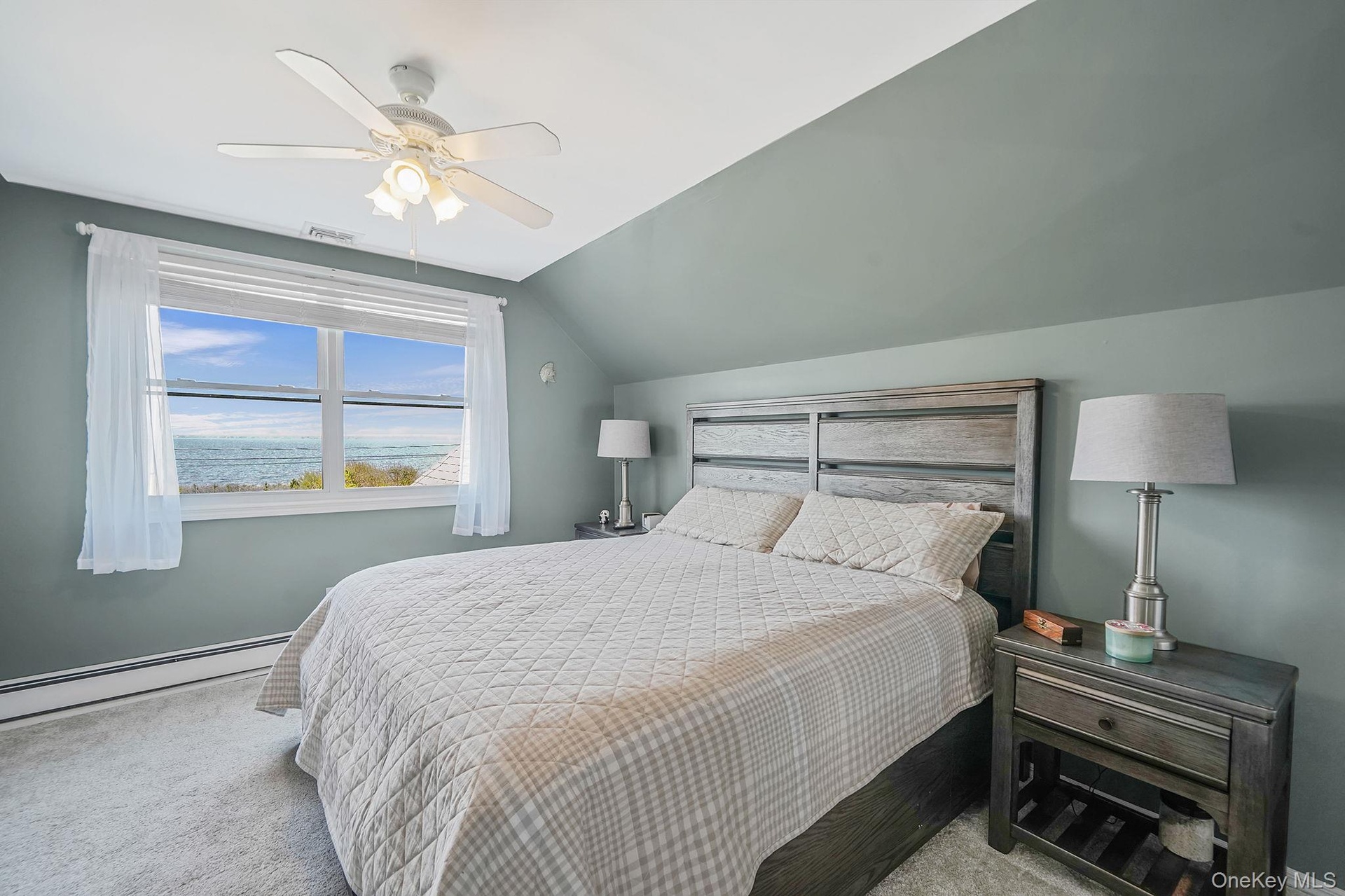 - Carpeted bedroom with baseboards, ceiling fan, baseboard heating, and lofted ceiling
