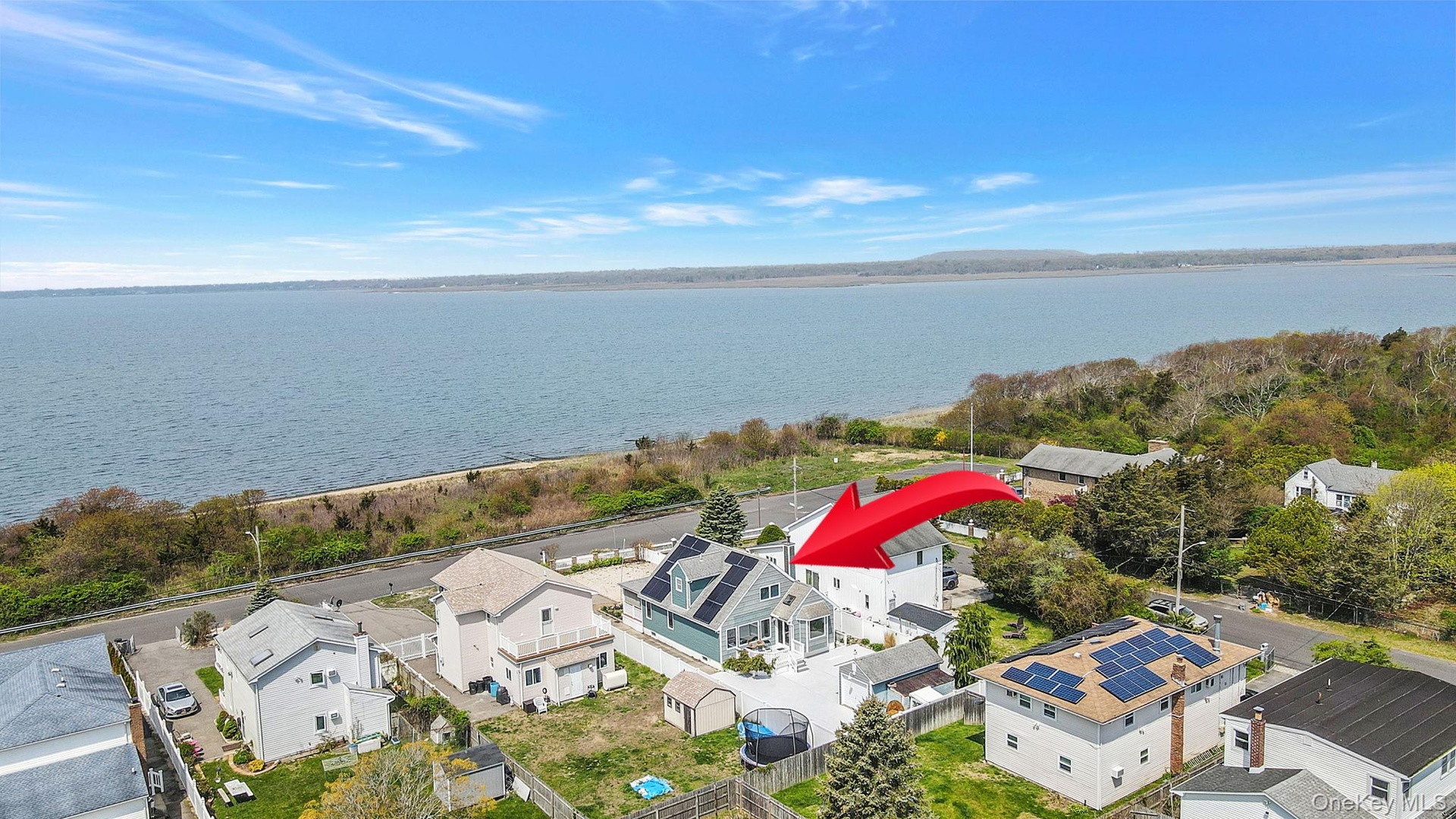 - Drone / aerial view featuring a residential view, a beach view, and a water view
