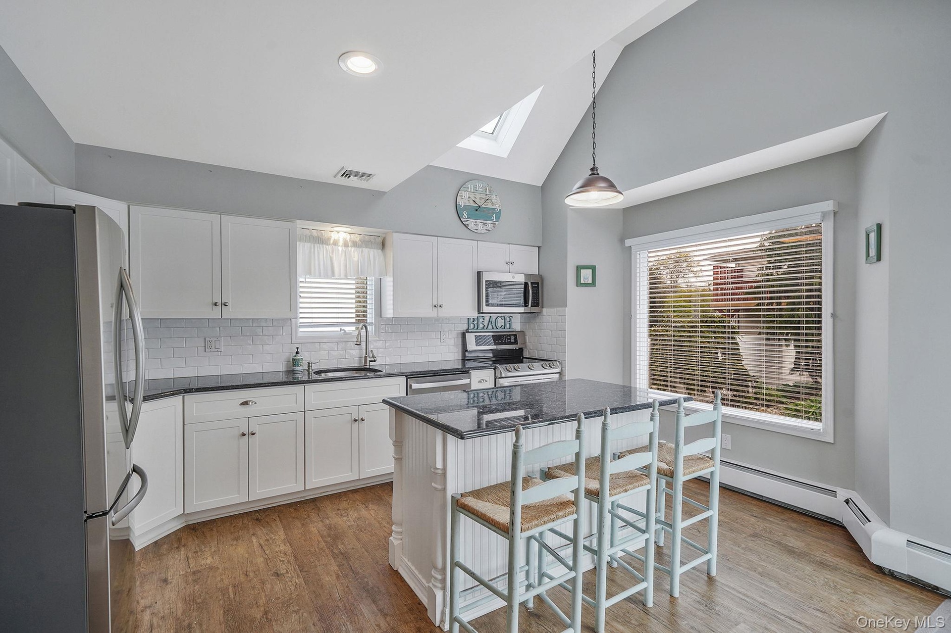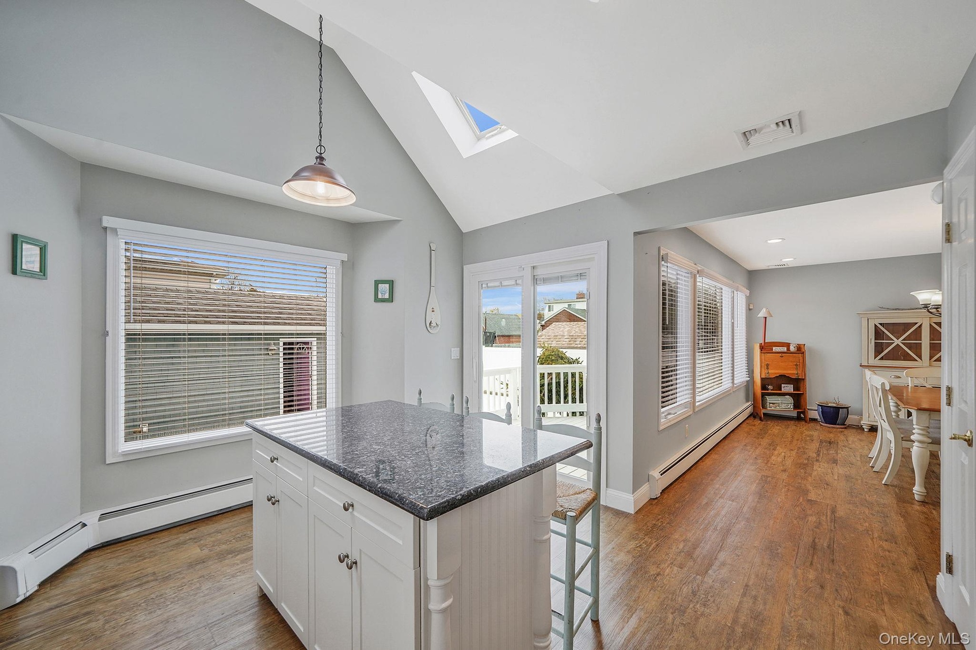 - Kitchen with a baseboard radiator, a kitchen island, dark wood-style floors, and white cabinetry