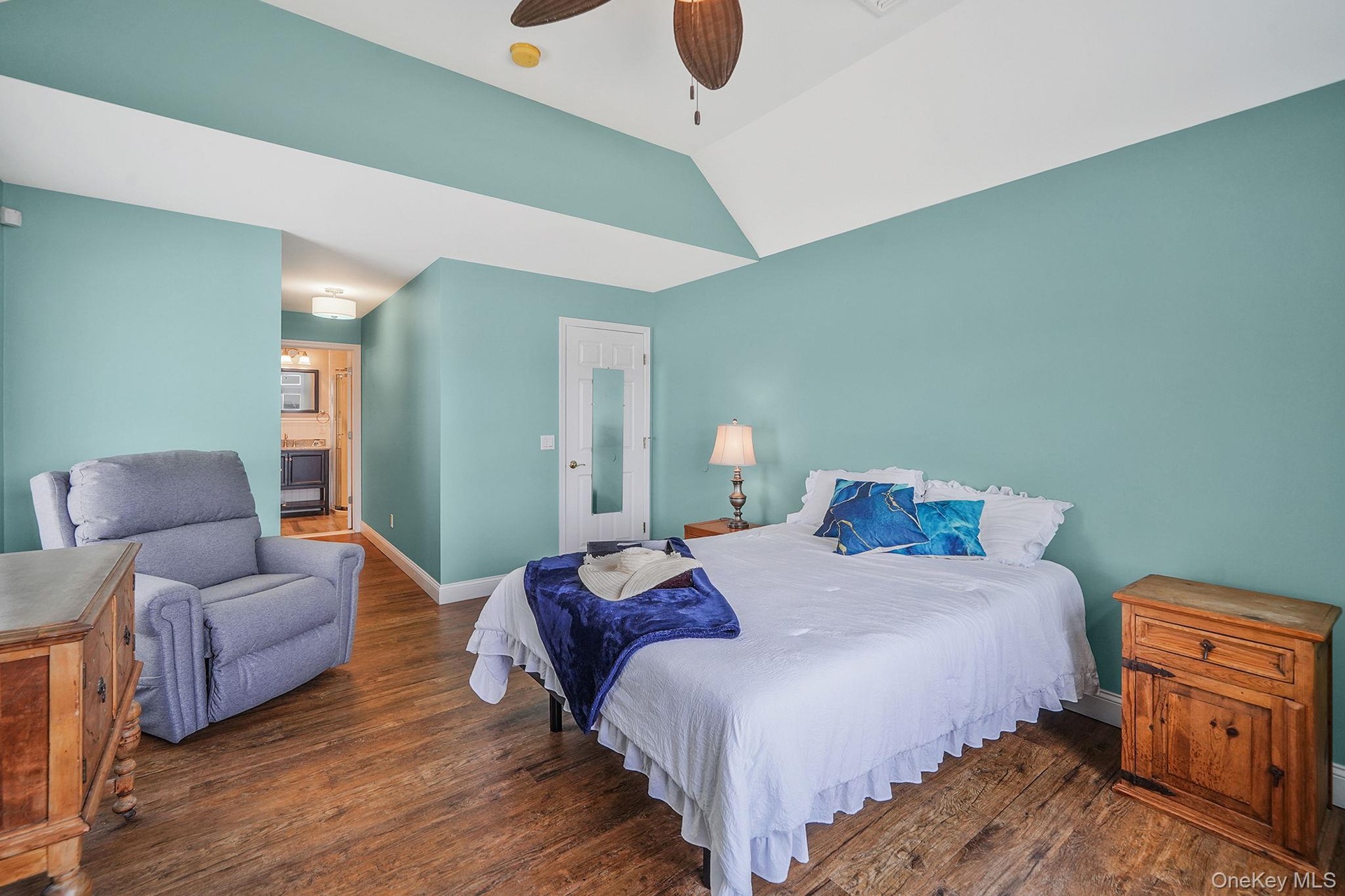 - Bedroom with baseboards, connected bathroom, wood finished floors, and vaulted ceiling