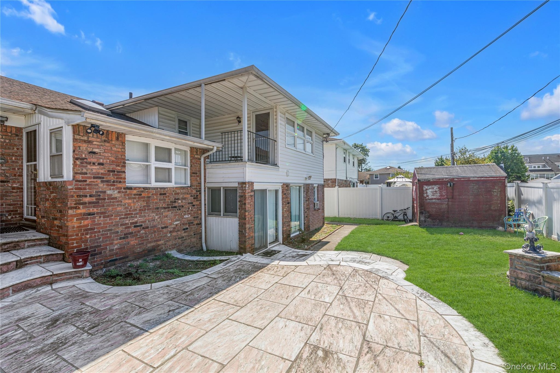- Rear view of house with a shed, a fenced backyard, a balcony, brick siding, and a patio