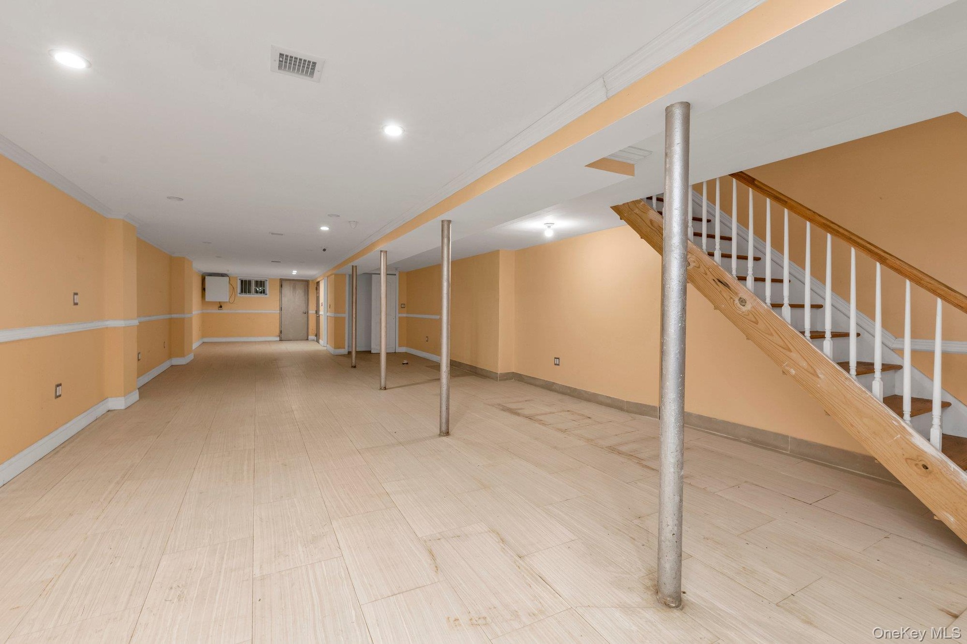 - Finished below grade area featuring stairway, crown molding, and recessed lighting