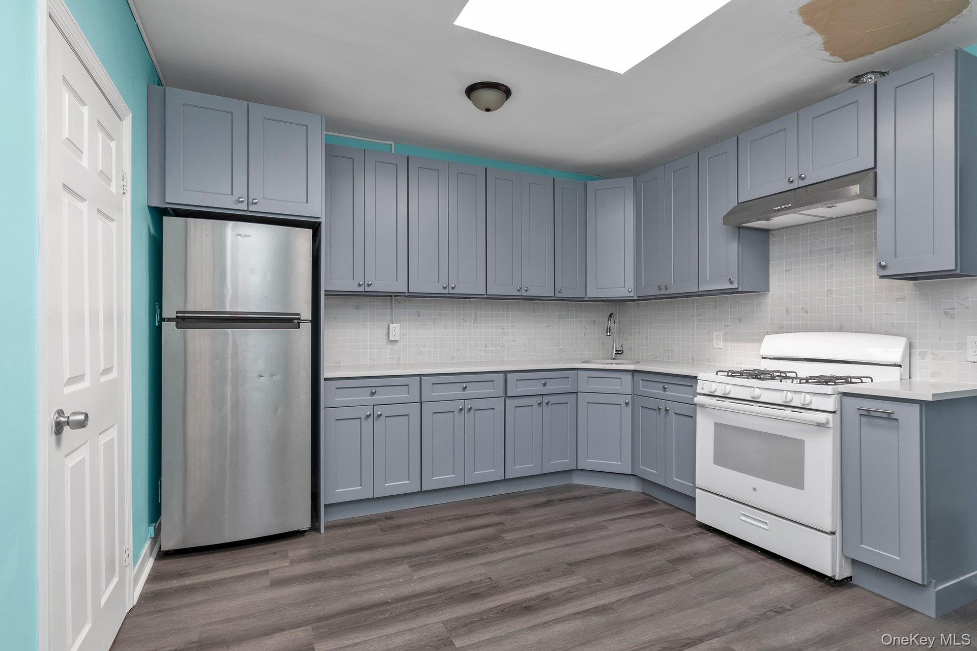 - Kitchen with gray cabinets, dark wood-style floors, decorative backsplash, freestanding refrigerator, and a skylight