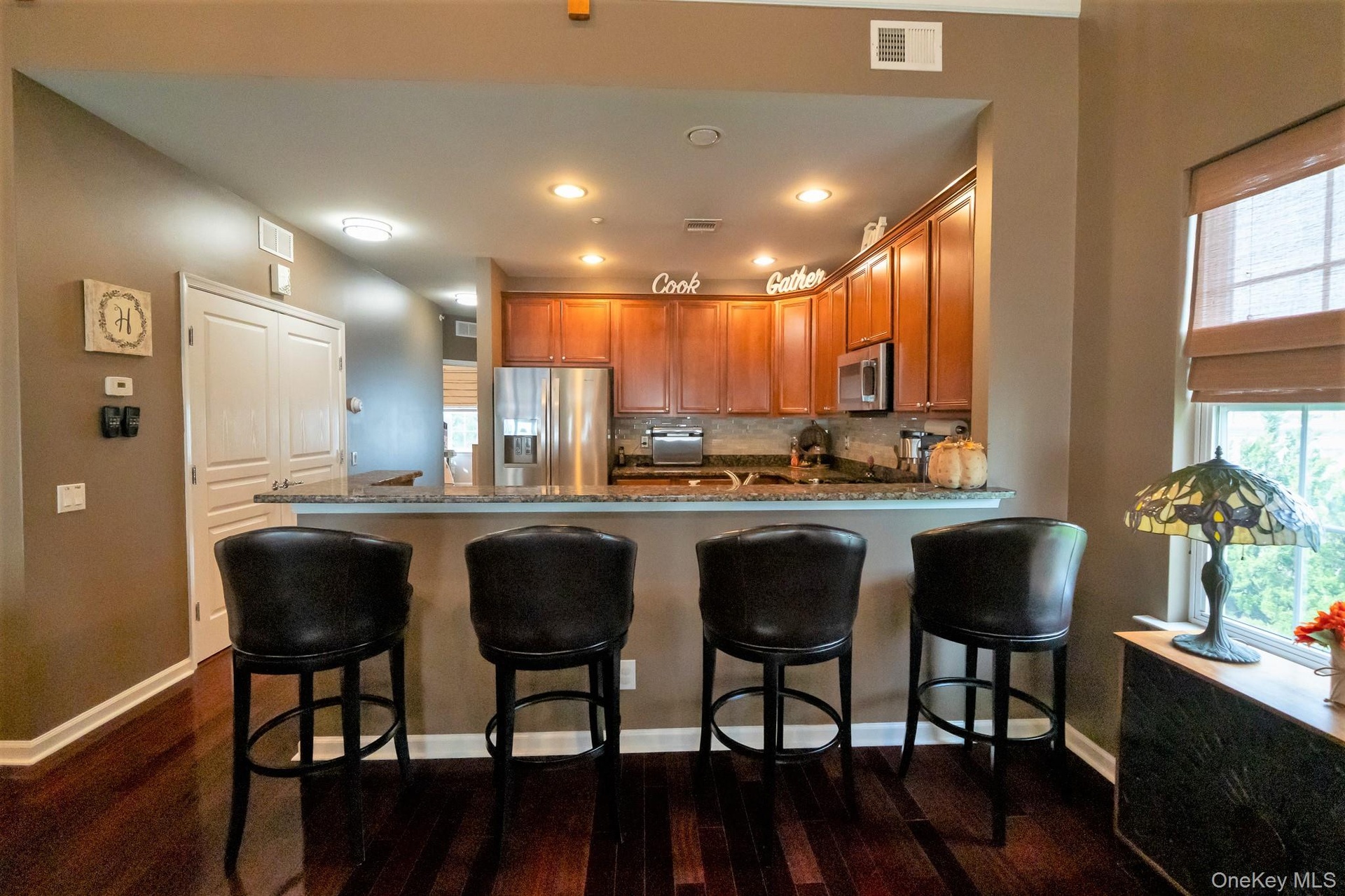 - Kitchen with dark stone counters, a kitchen breakfast bar, brown cabinets, a peninsula, and stainless steel appliances