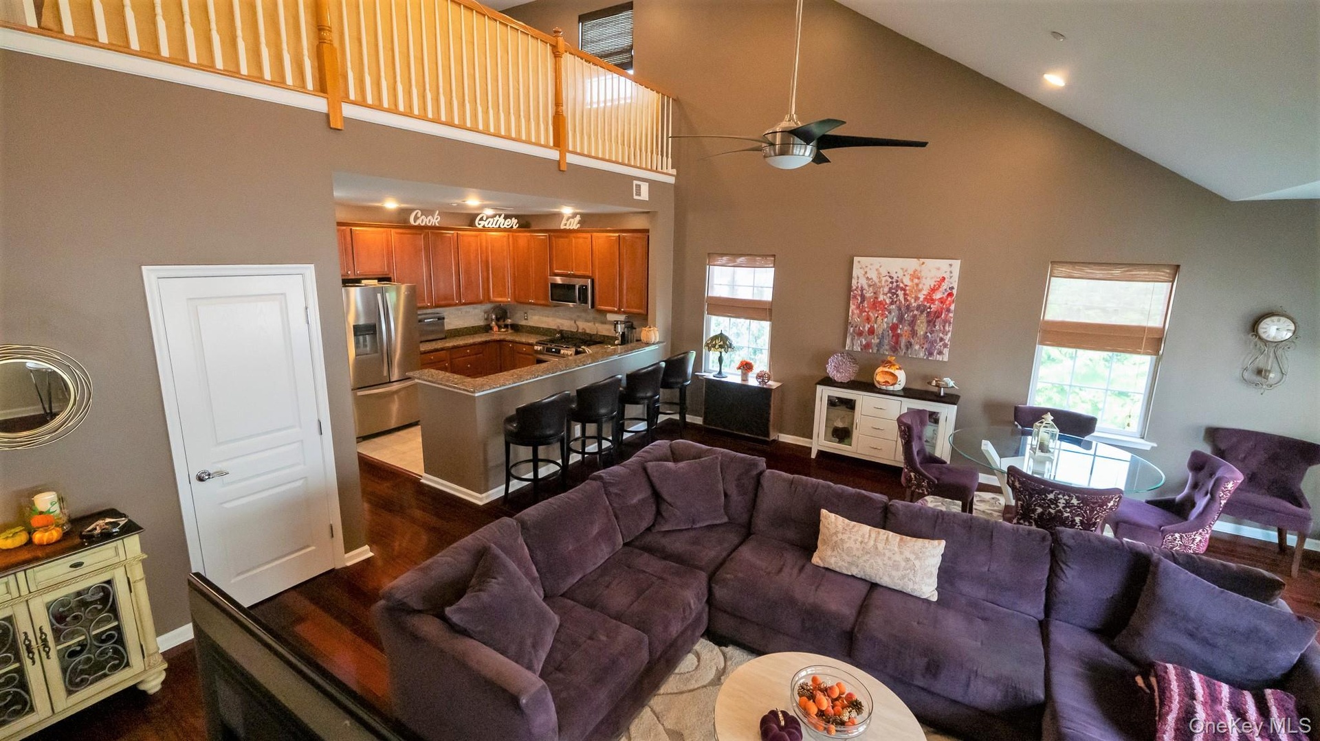 - Living area with dark wood-type flooring, ceiling fan, and high vaulted ceiling