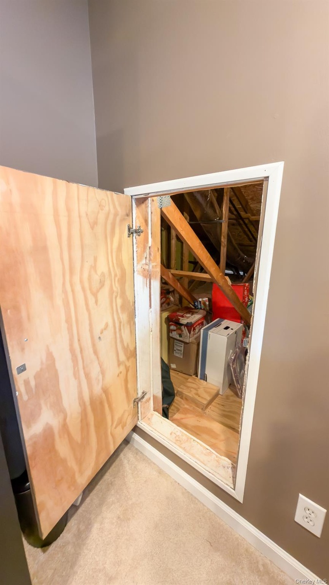 - Hallway with plenty of natural light, recessed lighting, lofted ceiling, and carpet flooring