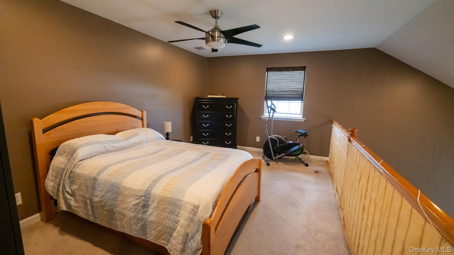 - Bedroom featuring light carpet, ceiling fan, vaulted ceiling, and recessed lighting