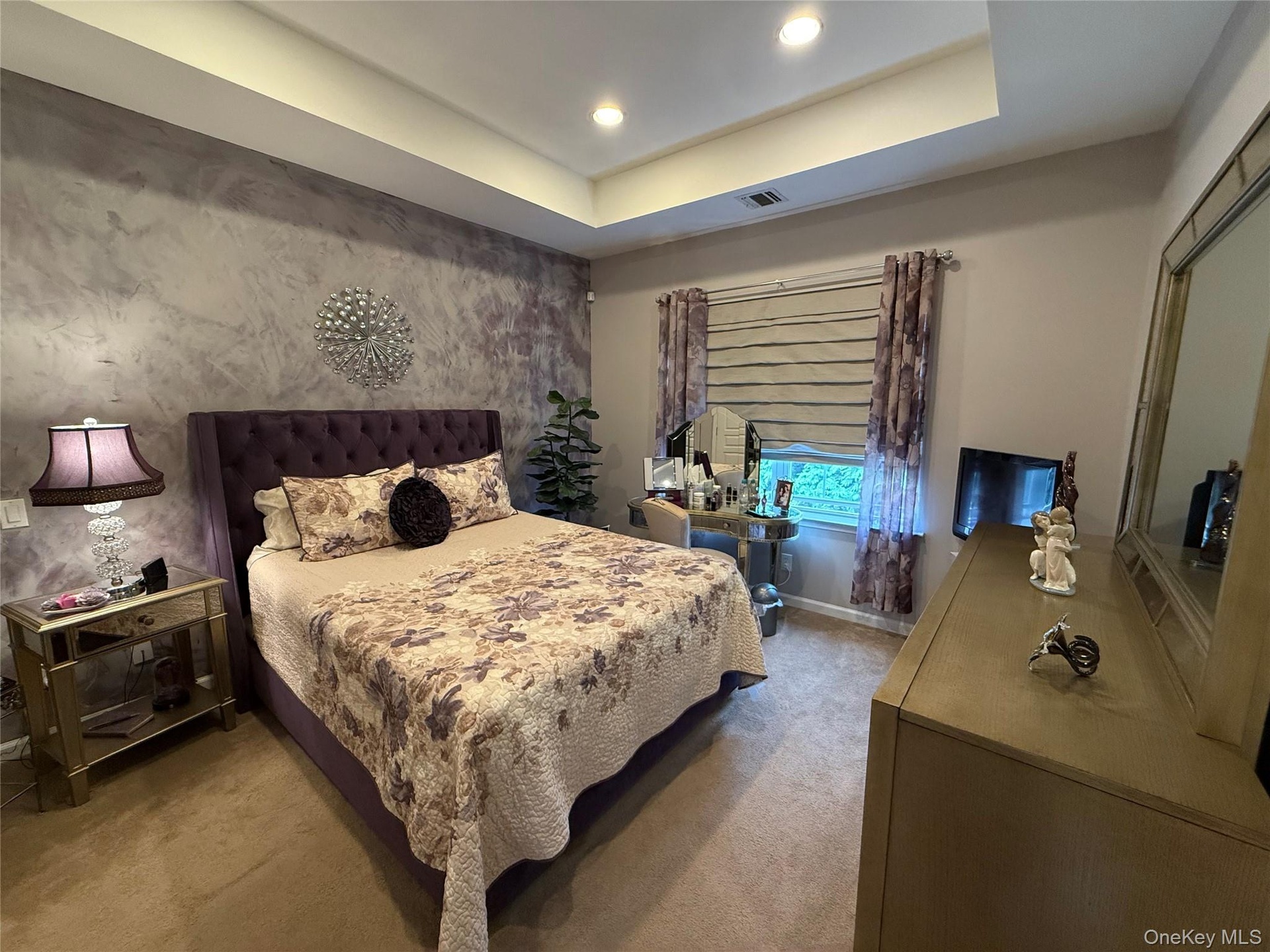 - Bedroom featuring a raised ceiling, an accent wall, light colored carpet, recessed lighting, and wallpapered walls